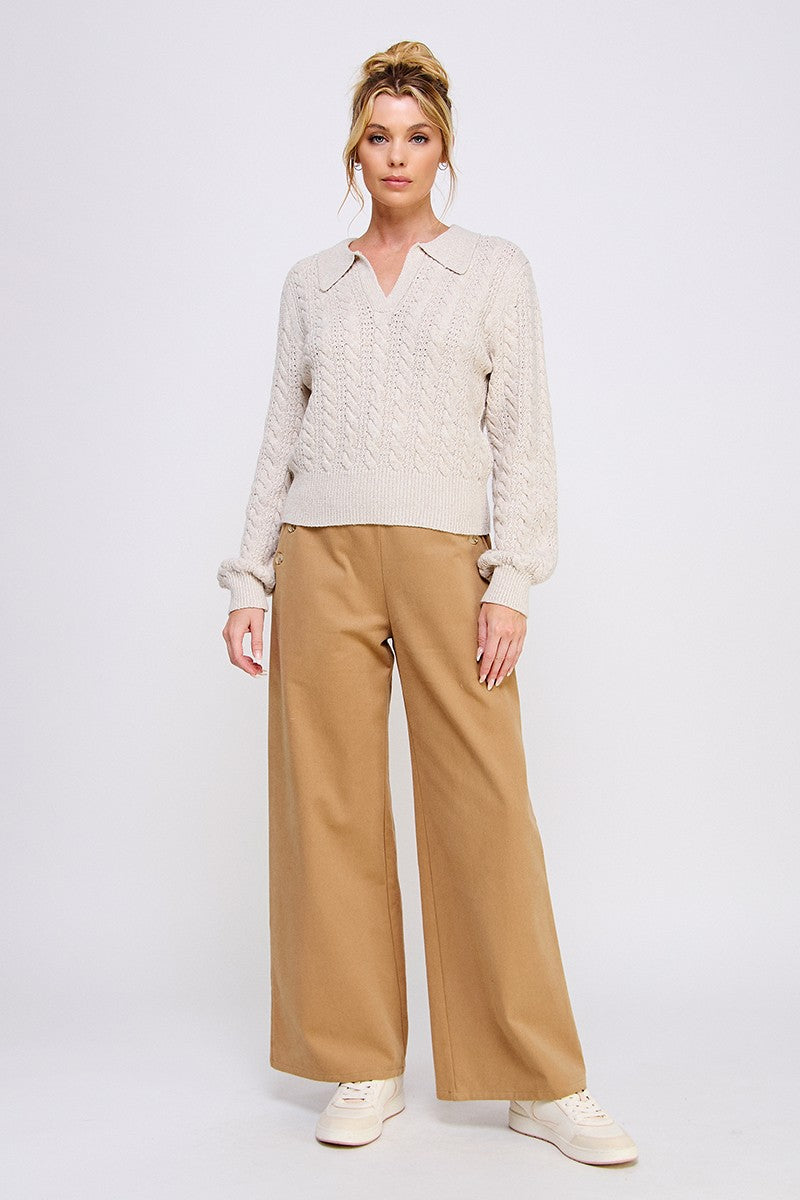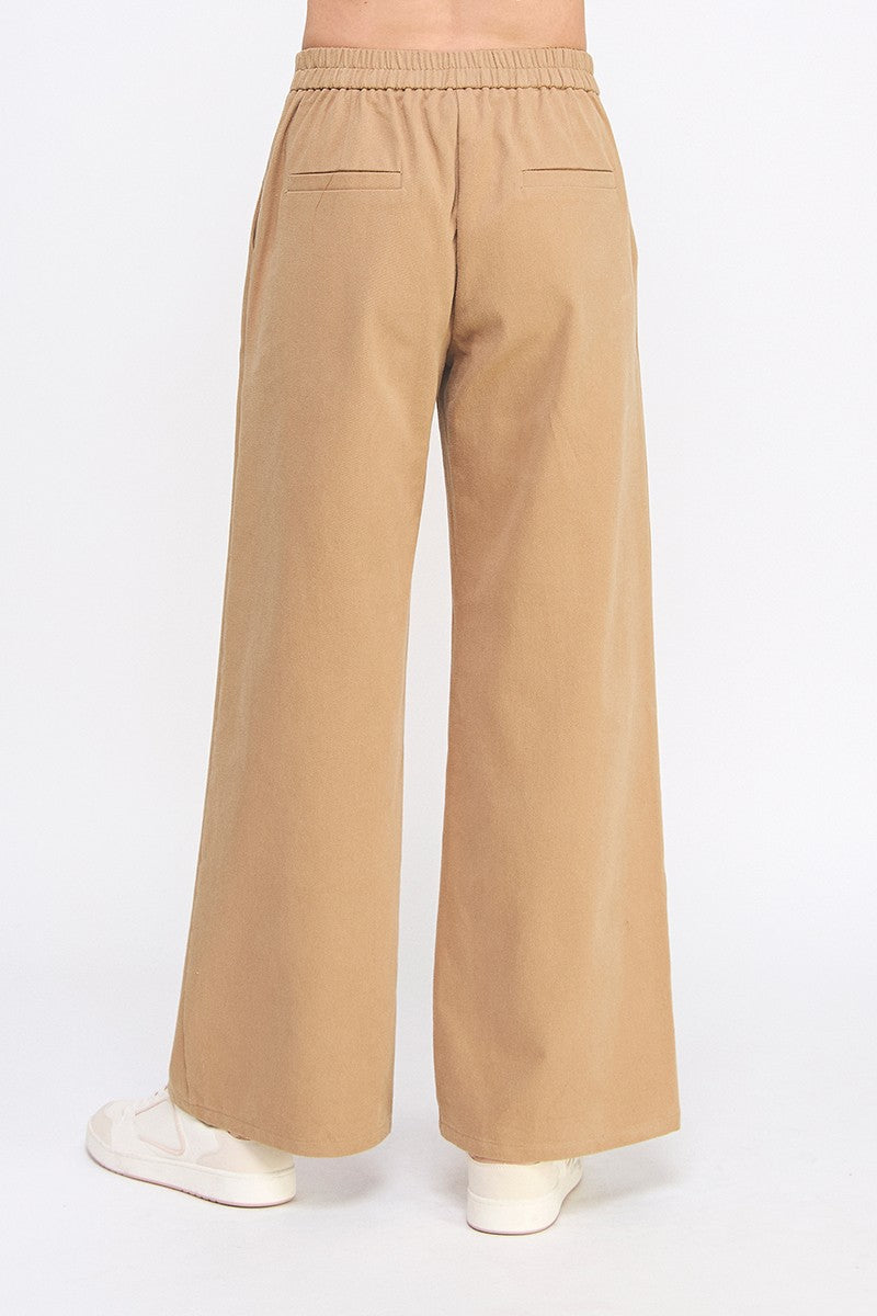 Meet Caleb, your new go-to for relaxed vibes and effortless style. These wide pants in soft, heavy twill offer cozy comfort with a playful shape that moves with you. The tan color adds warmth, while the button pocket detail and elastic back waistband keep things fun and functional. Perfect for days when you want to feel easygoing but still put together.