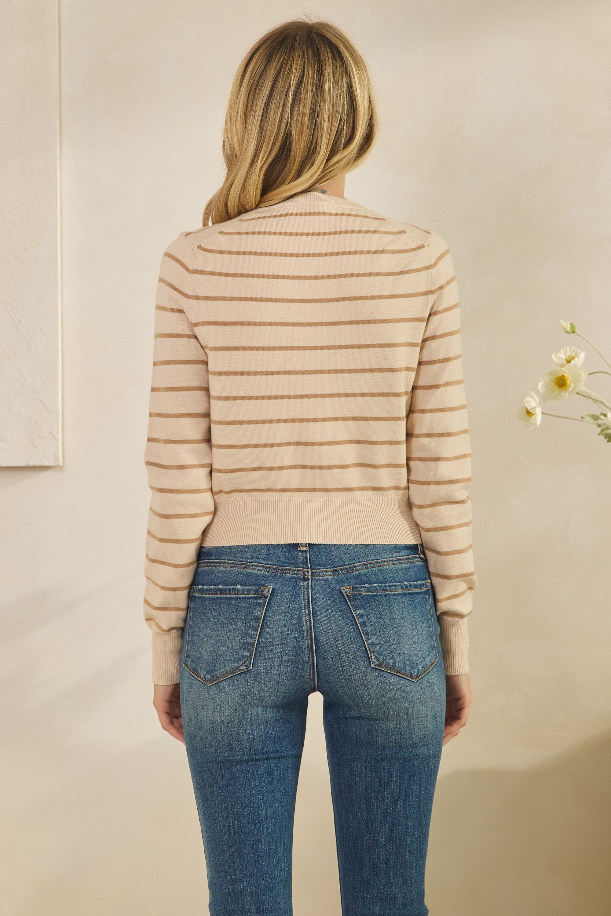 Introducing the Camille cardigan—a versatile layering essential with a soft, comfortable feel. This cropped style features a classic crew neck and convenient button-down front, making it easy to wear open or closed. The subtle striped pattern adds visual interest while maintaining a timeless appeal. Perfect for pairing with your favourite tops and dresses, this cardigan transitions seamlessly from season to season.