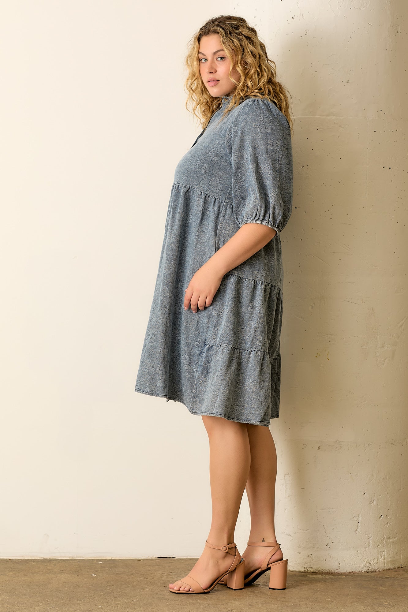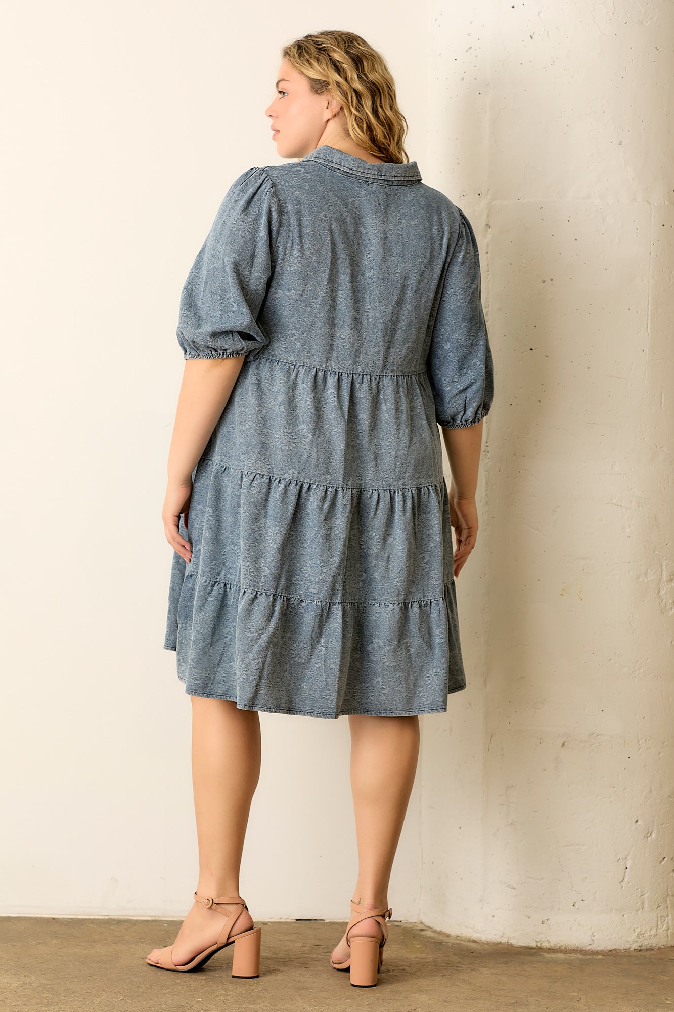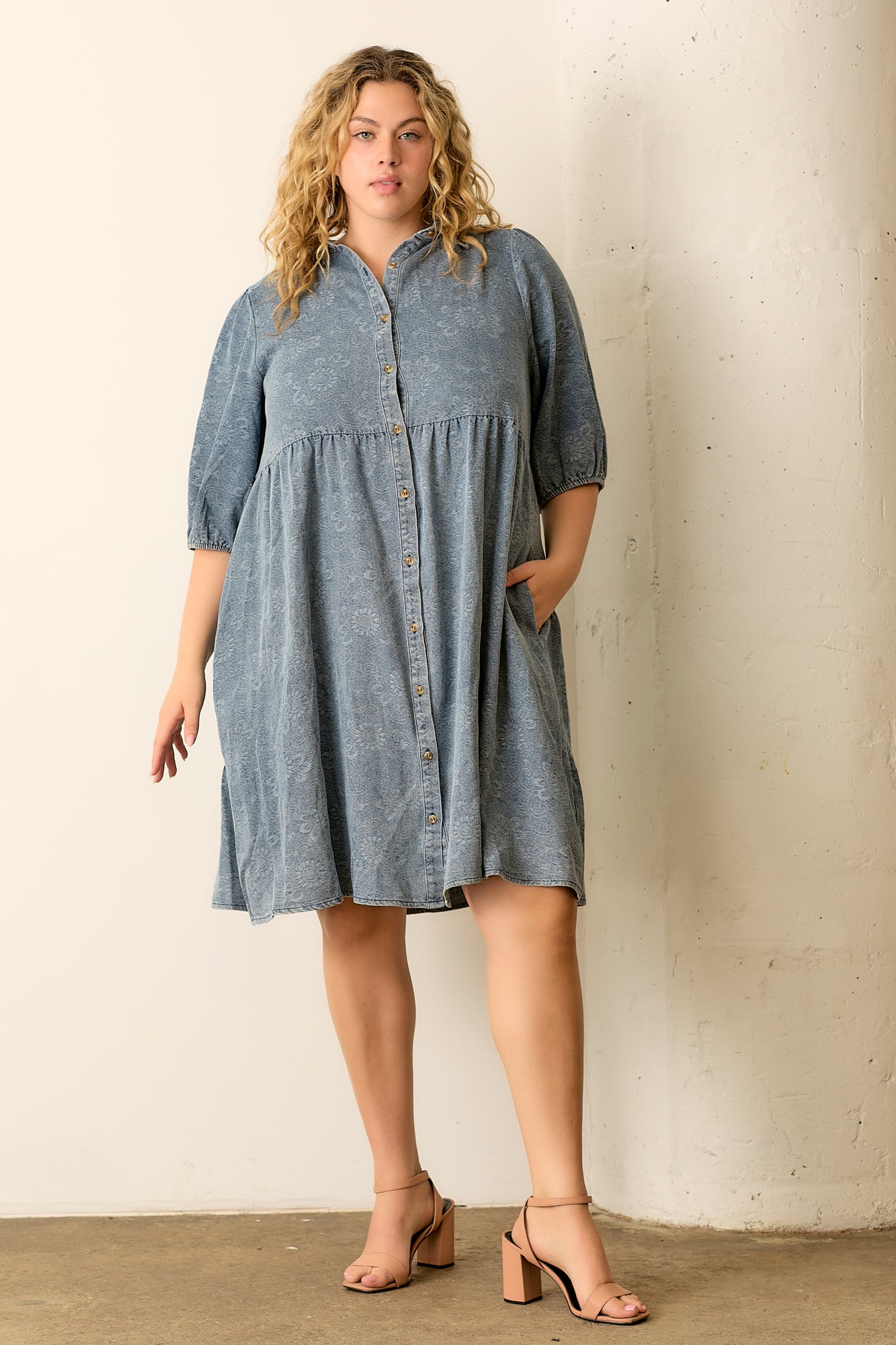 This playful mini dress combines fun and function with its vibrant printed denim fabric and button-front design. Featuring a stylish collar and short bubble sleeves, it adds charm to your look. The tiered skirt detail in the back gives a flirty flair, while convenient pockets add a practical touch. Perfect for carefree days and easygoing evenings.