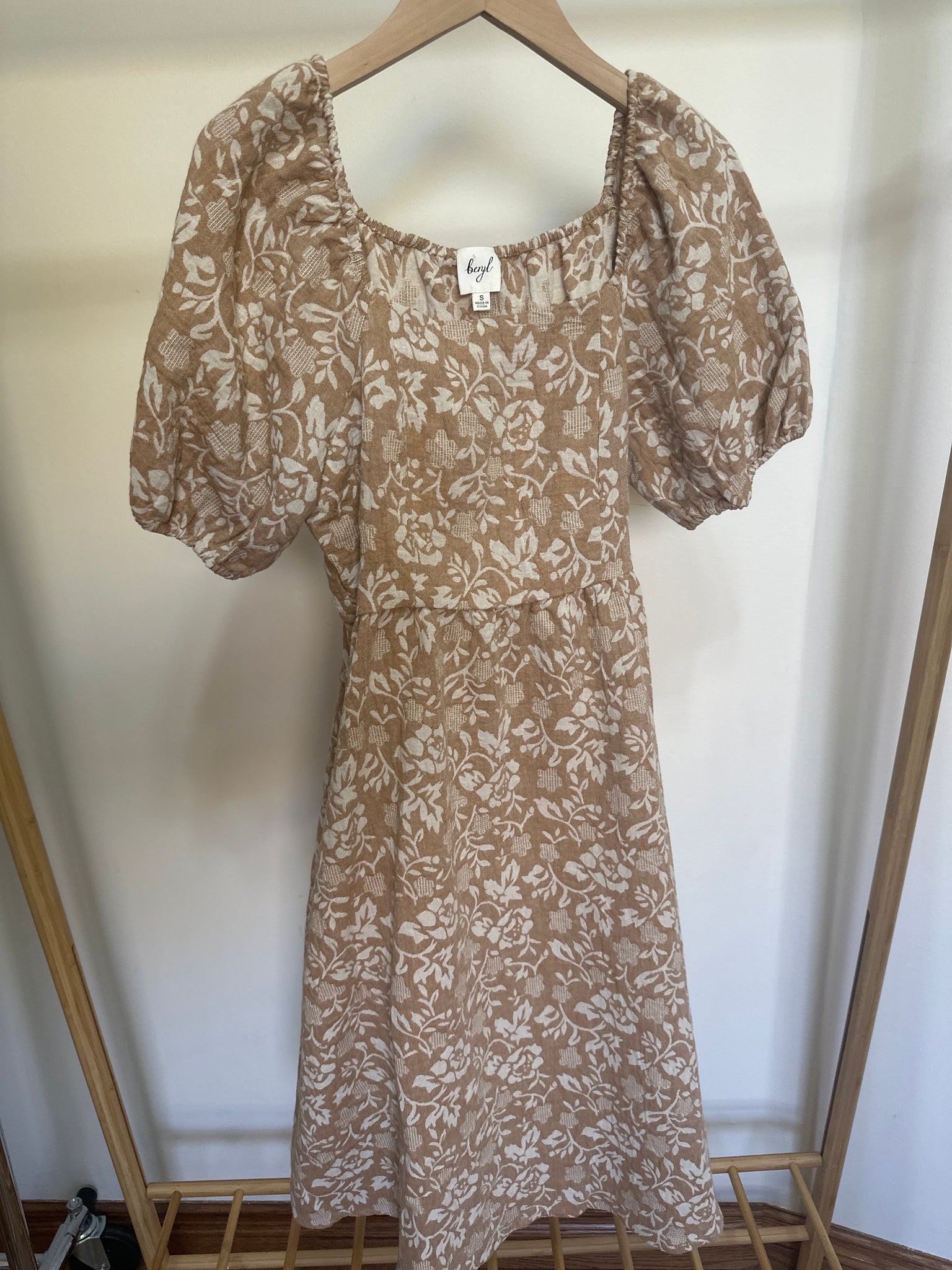Step into charm with the Ms. Penelope midi dress, featuring a delightful cream and beige floral jacquard print. Its short bubble sleeves and square neckline add a whimsical touch, while the elasticized waist ensures a comfy, flattering fit. Perfect for twirling through sunlit afternoons or making every day a little more special.
