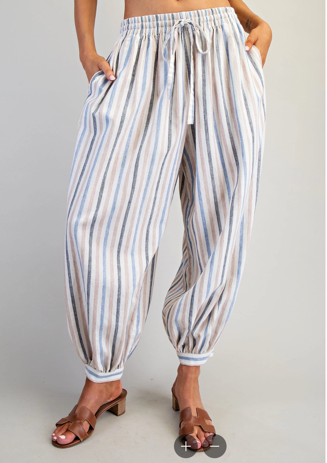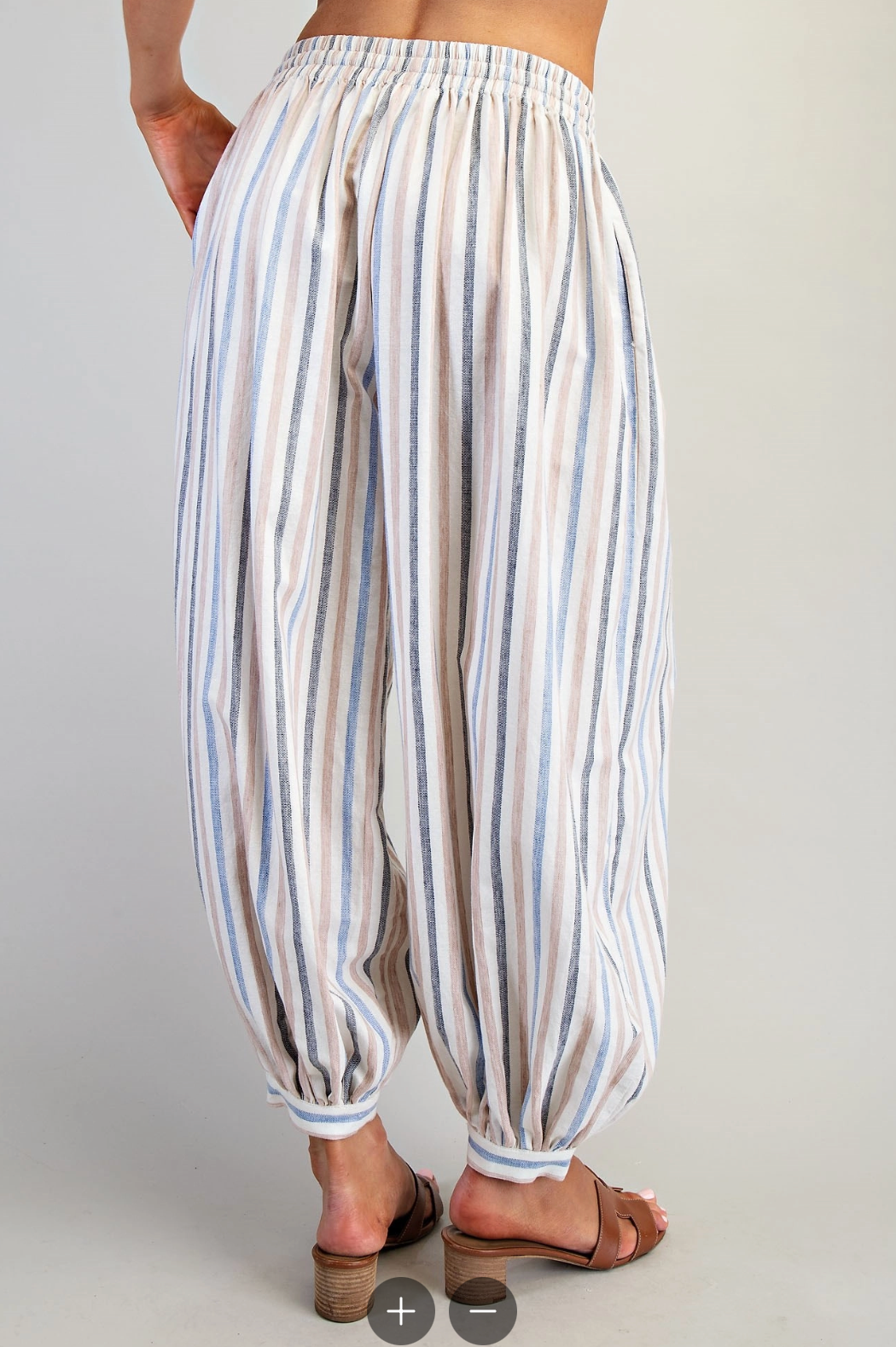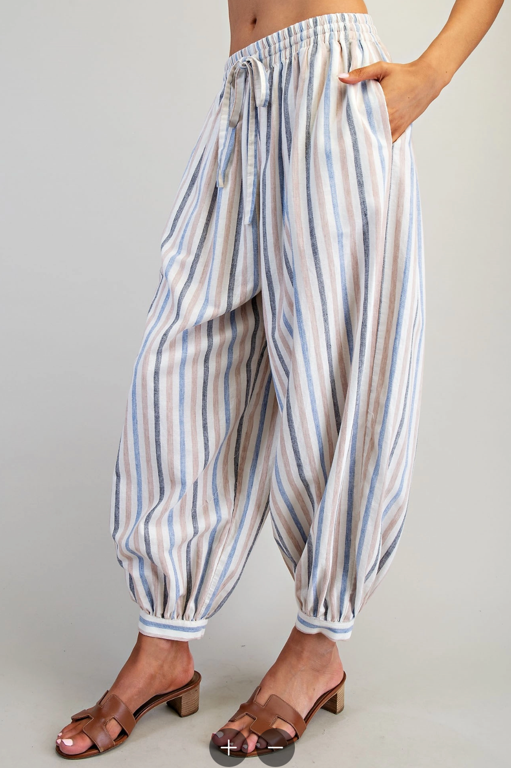 These lightweight striped pants feature a relaxed balloon leg silhouette that tapers into cuffs, a comfortable elastic waistband with a drawstring tie, and functional side pockets for an effortless, breezy look.