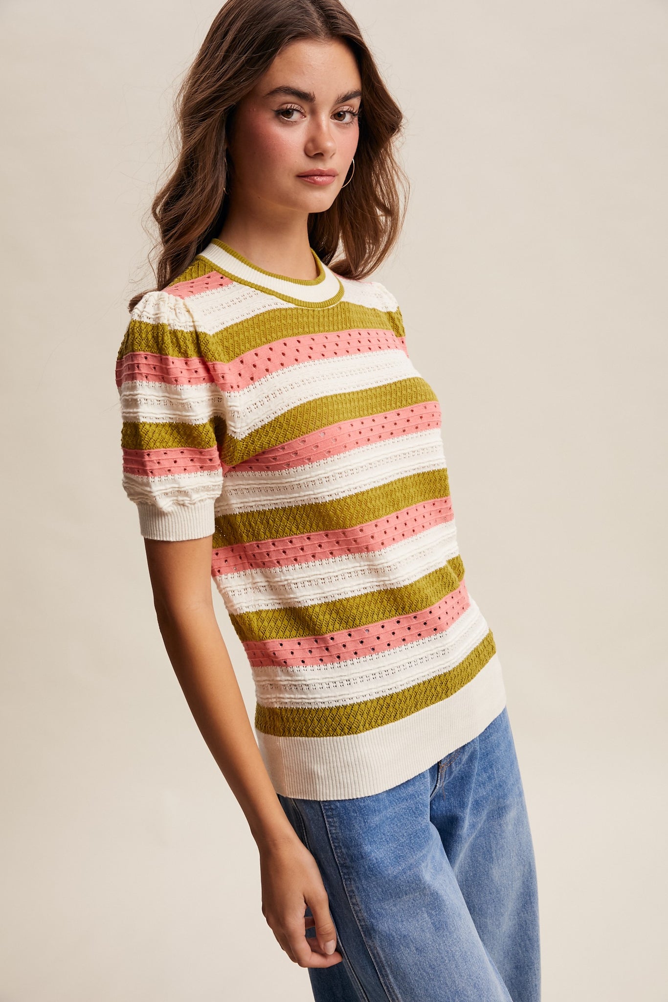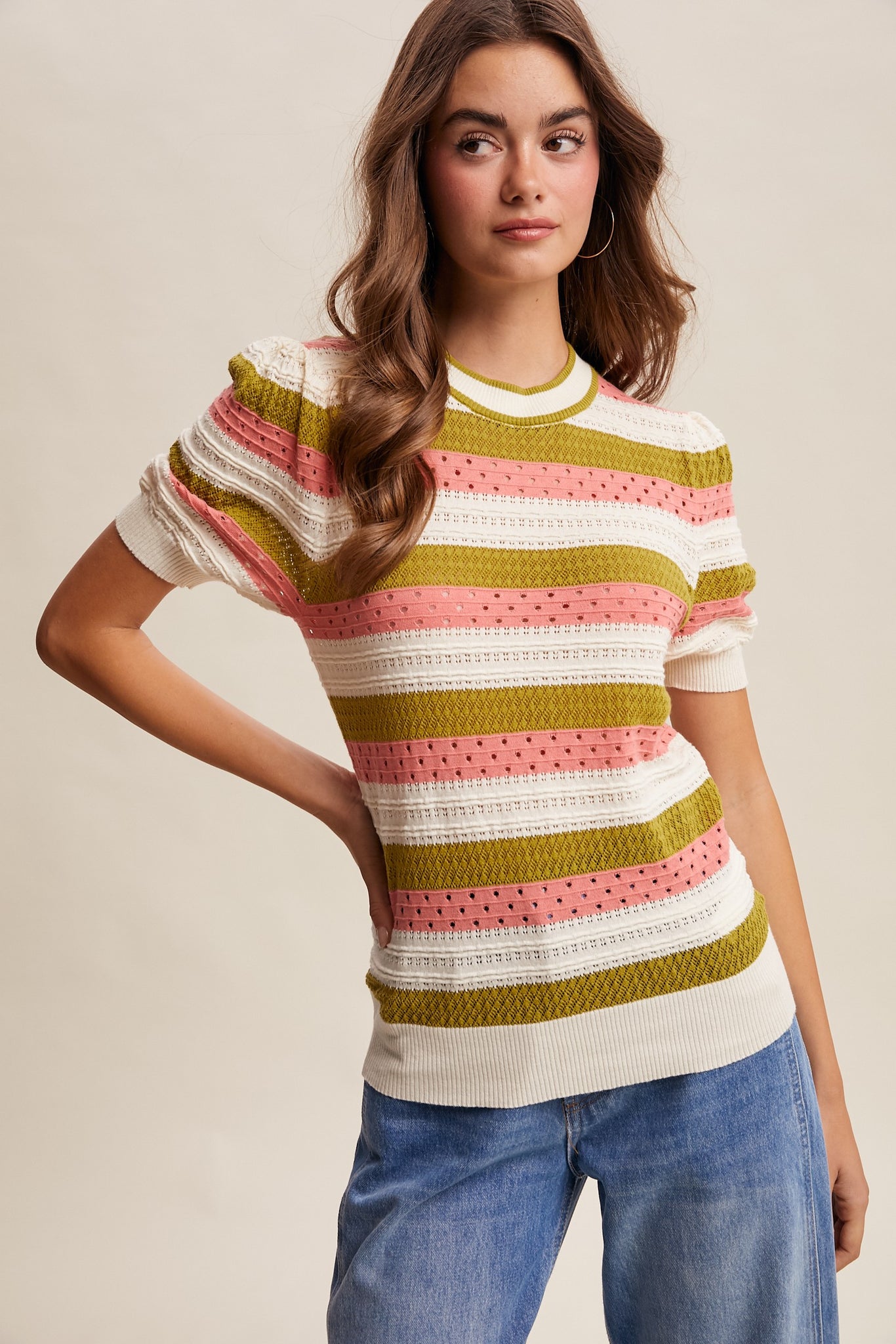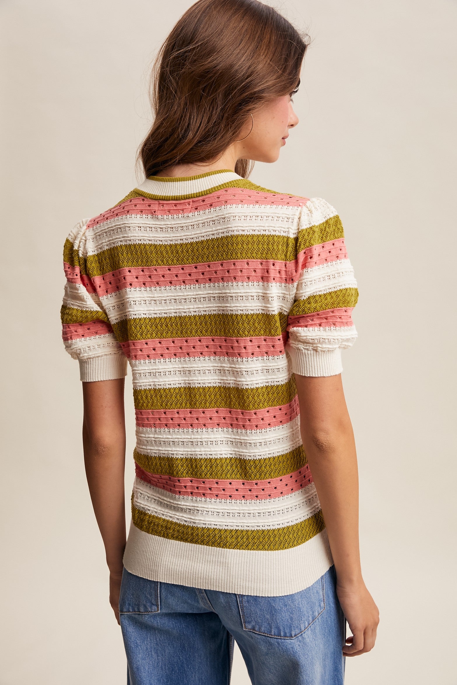 Watermelon Sugar top features bold stripes in a lightweight pointelle knit that's perfect for warm weather layering. The short puff sleeves add a playful touch, while ribbed hem and cuffs provide a polished finish. Designed with a classic crew neckline for everyday comfort and versatility.