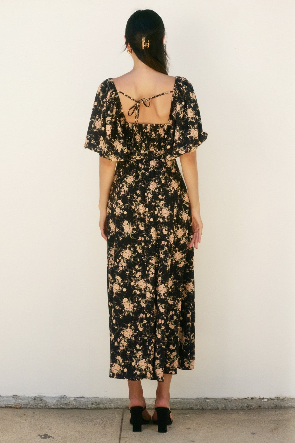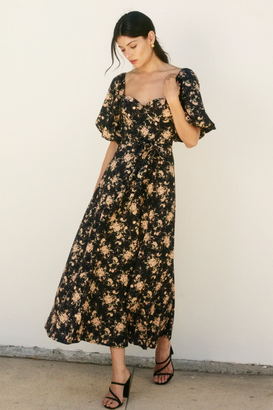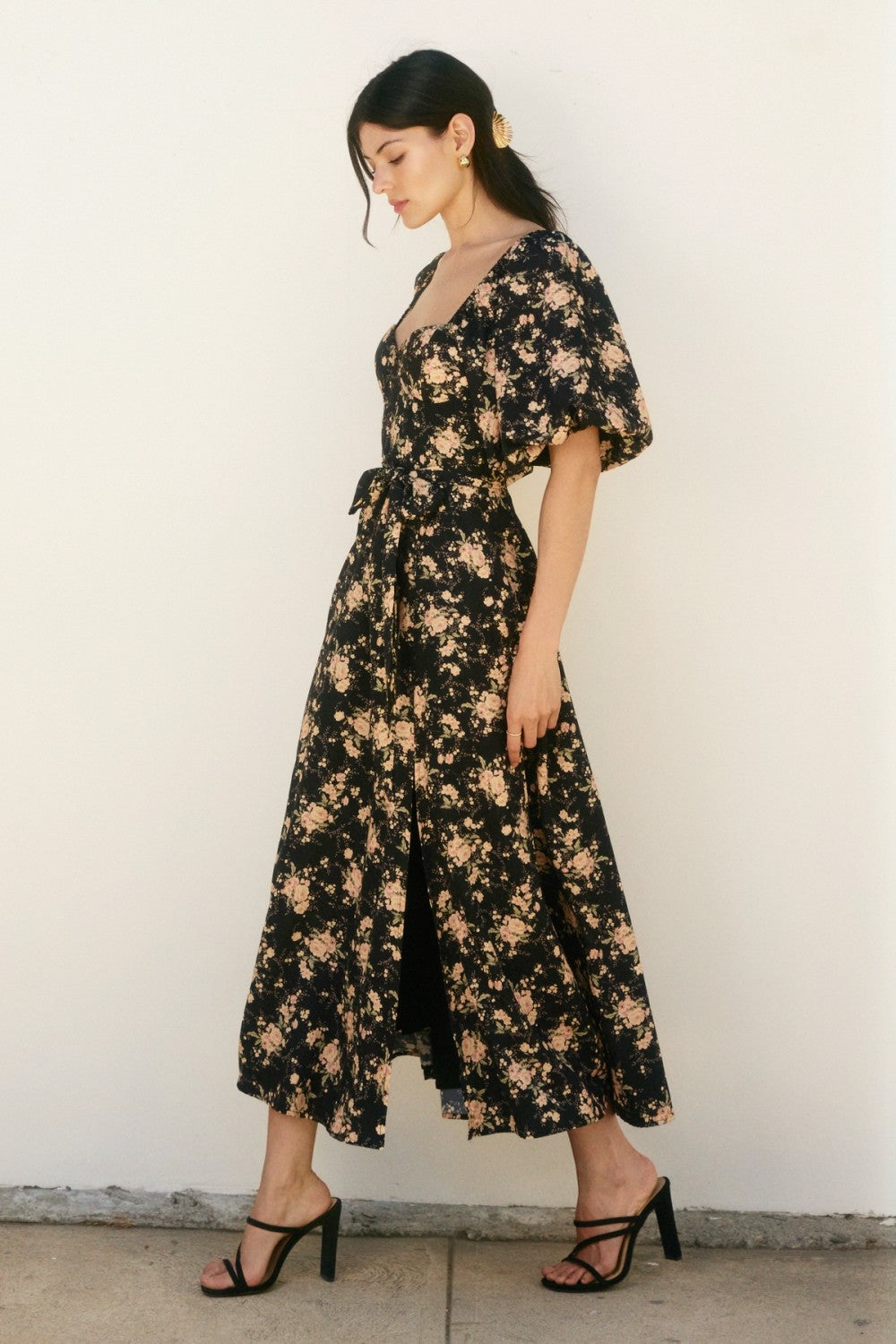 This playful maxi dress features a romantic floral print with blouson puff sleeves and a sweet sweetheart neckline, perfect for twirling into the evening. The side slit adds a flirty touch, while the tie detail at the back ensures a perfect fit. With built-in bra cup detail and a fully lined design, you can enjoy both comfort and style in one effortlessly charming look.