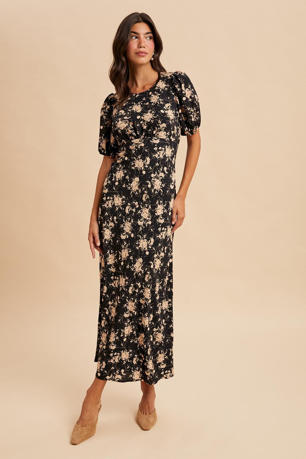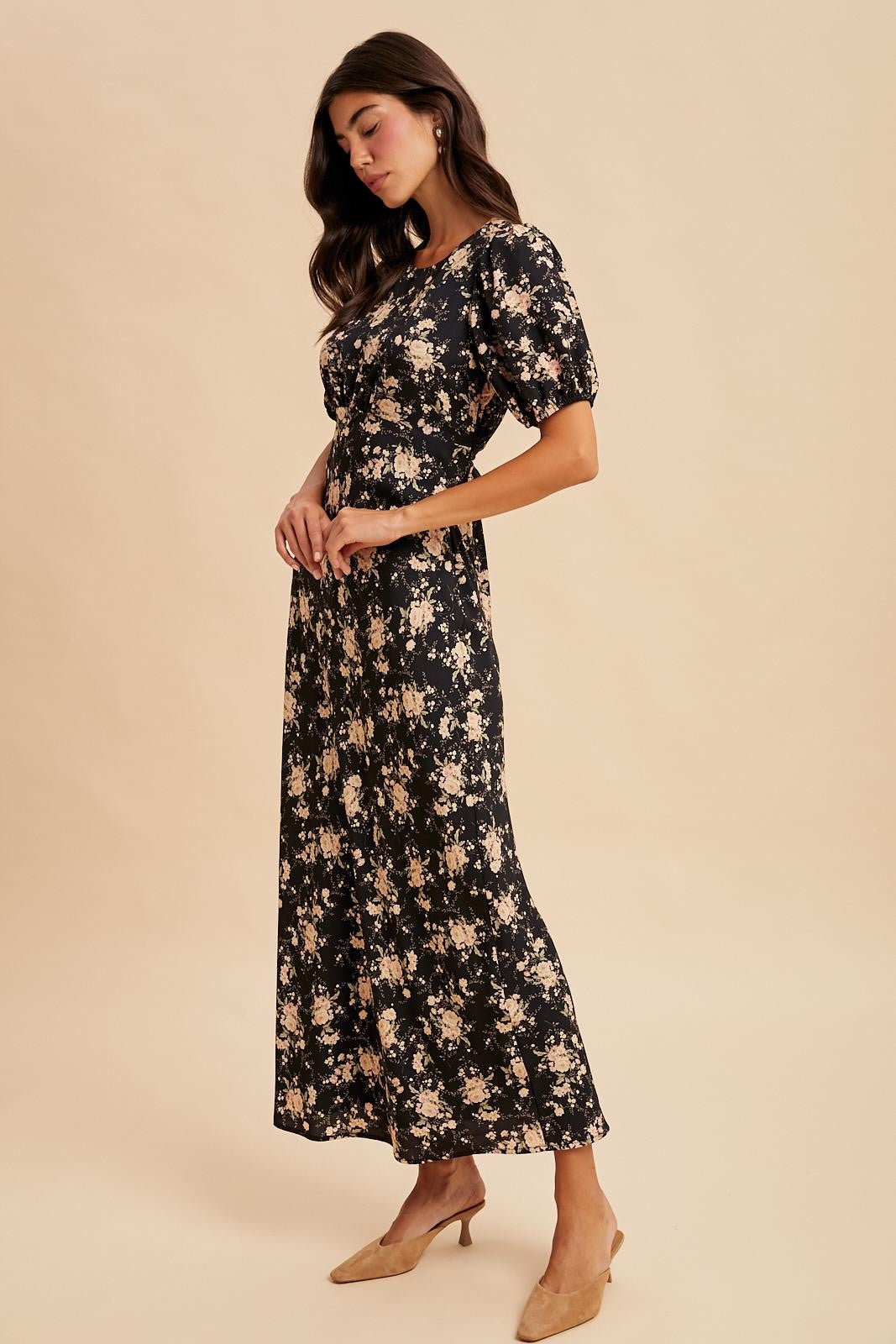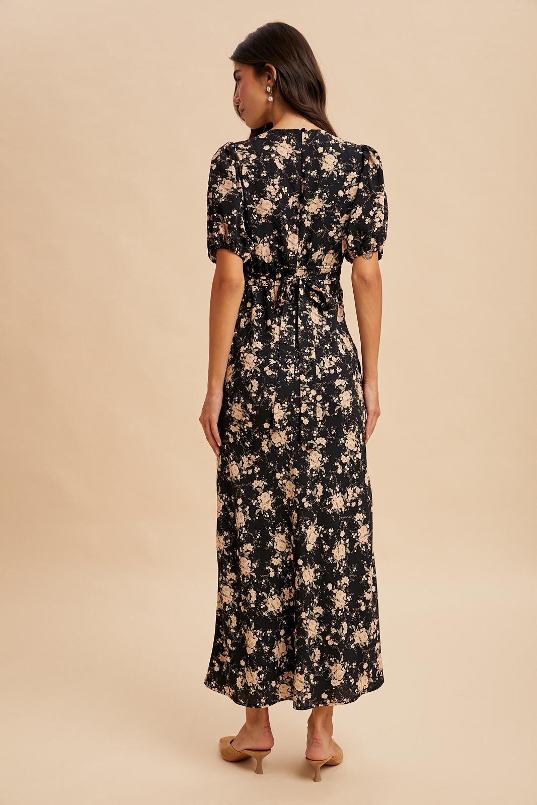 Elevate your style with the Dark Roses maxi dress, featuring a romantic floral print and a flattering fitted column silhouette. Playful puff elastic sleeves add a whimsical touch, while the elastic waistband at the back ensures comfort and a perfect fit. A belted self-tie ribbon accentuates your waist, and the fully lined design provides smooth elegance from top to bottom. Perfect for turning heads with effortless charm.