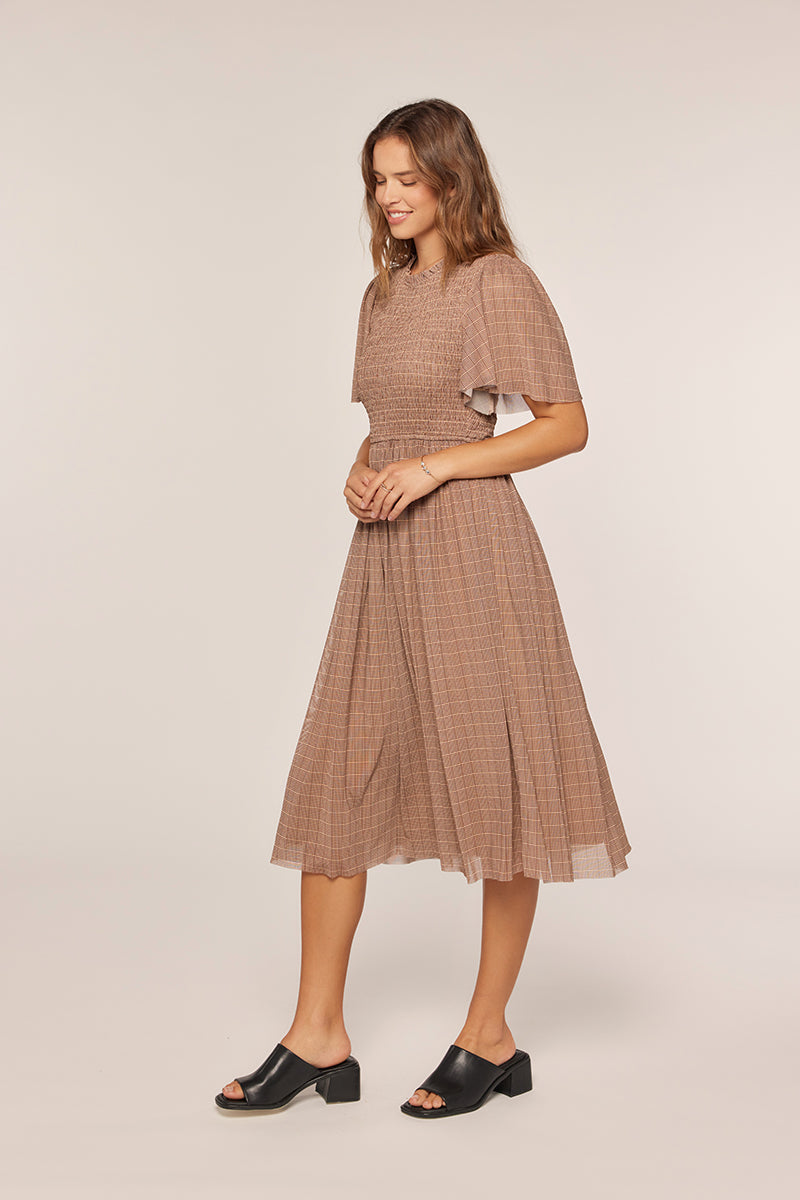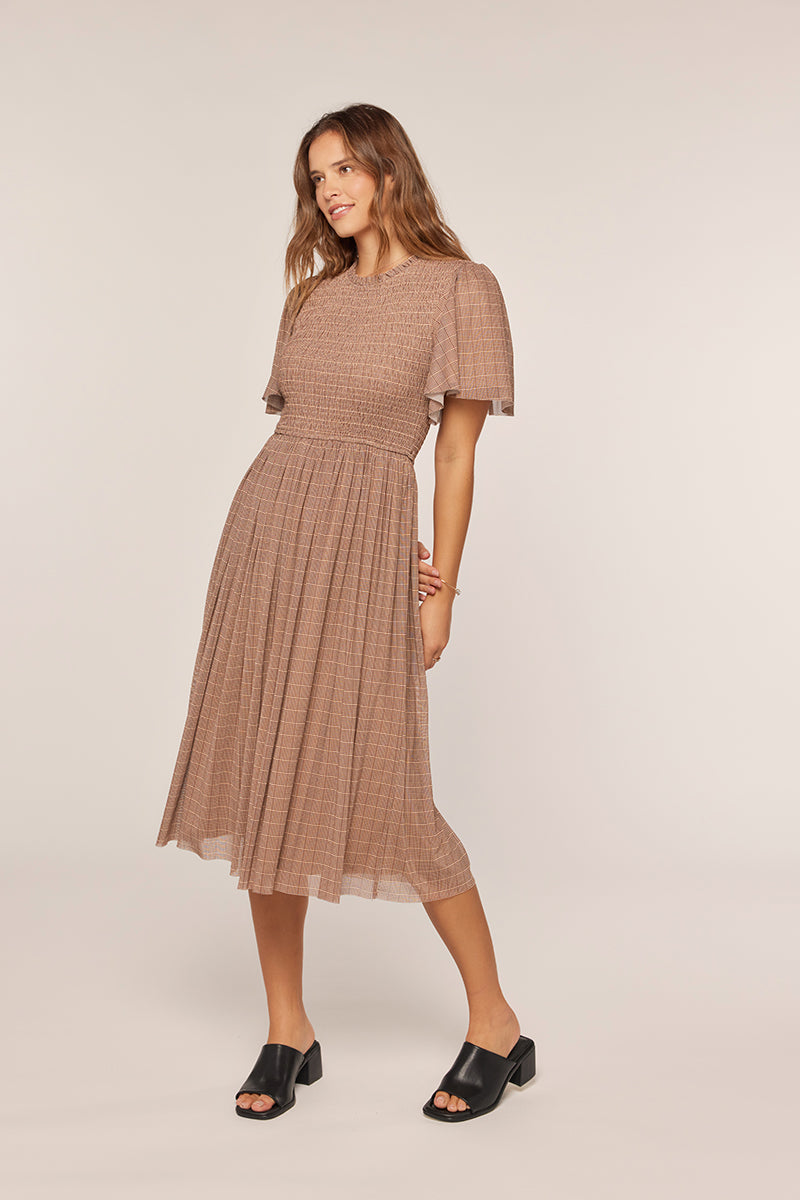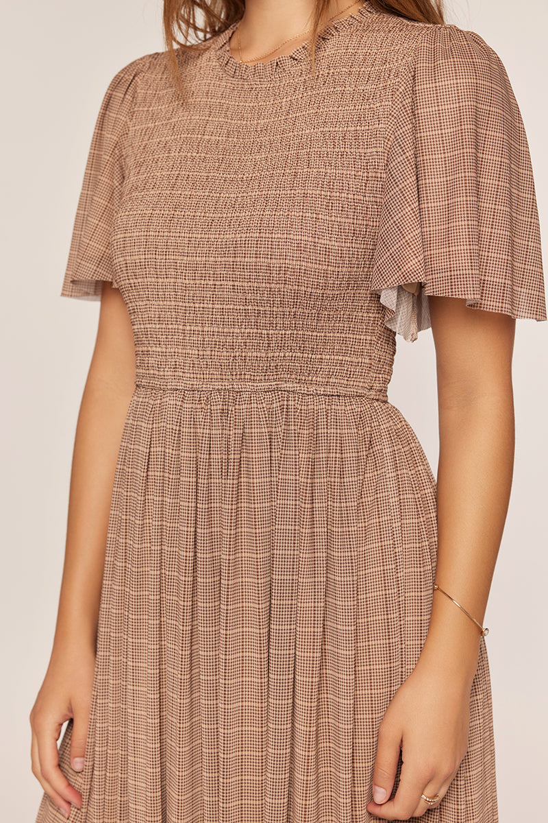 The Illyana midi dress combines playful charm with comfortable style. Crafted from plaid printed mesh fabric in warm beige and brown tones, it features a smocked bodice for a flattering fit and short flutter sleeves that add a touch of whimsy. The dress is fully lined for ease and modesty, with a ruffle neck detail and a back keyhole button closure for a delicate finish. Perfect for sunny days or casual outings, Illyana brings a fresh, breezy look to your wardrobe.