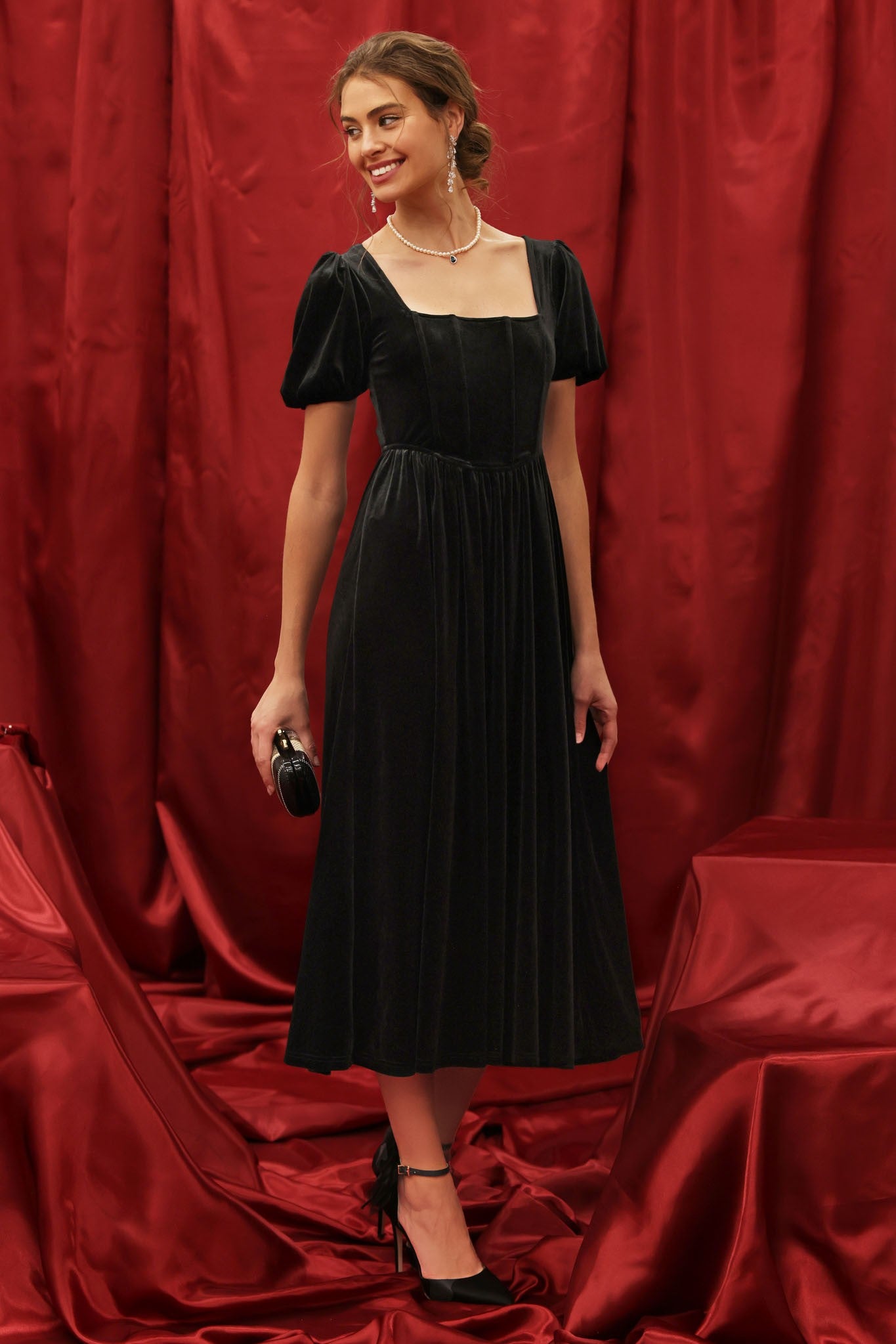 Rock your royal look with our Marie Antoinette midi dress. Made with luxurious velvet and a flattering a-line silhouette, this dress features a corset bodice and back smocking for a perfect fit. With a square neckline and short puff sleeves, it's the perfect blend of classic and contemporary. Go ahead, feel like a queen!
