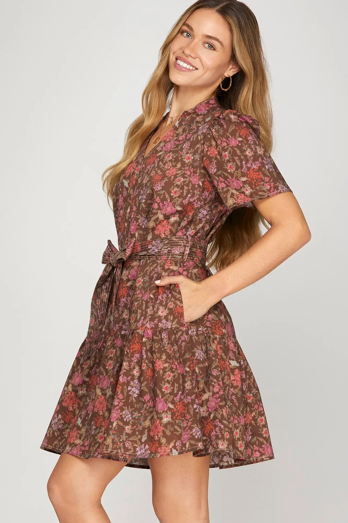 This playful mini dress features a vibrant woven floral print and a flattering v-neck. Short sleeves and a waist tie create a fun, feminine silhouette, while side pockets add a practical touch. Fully lined for comfortable wear, it’s perfect for sunny days and spontaneous adventures.