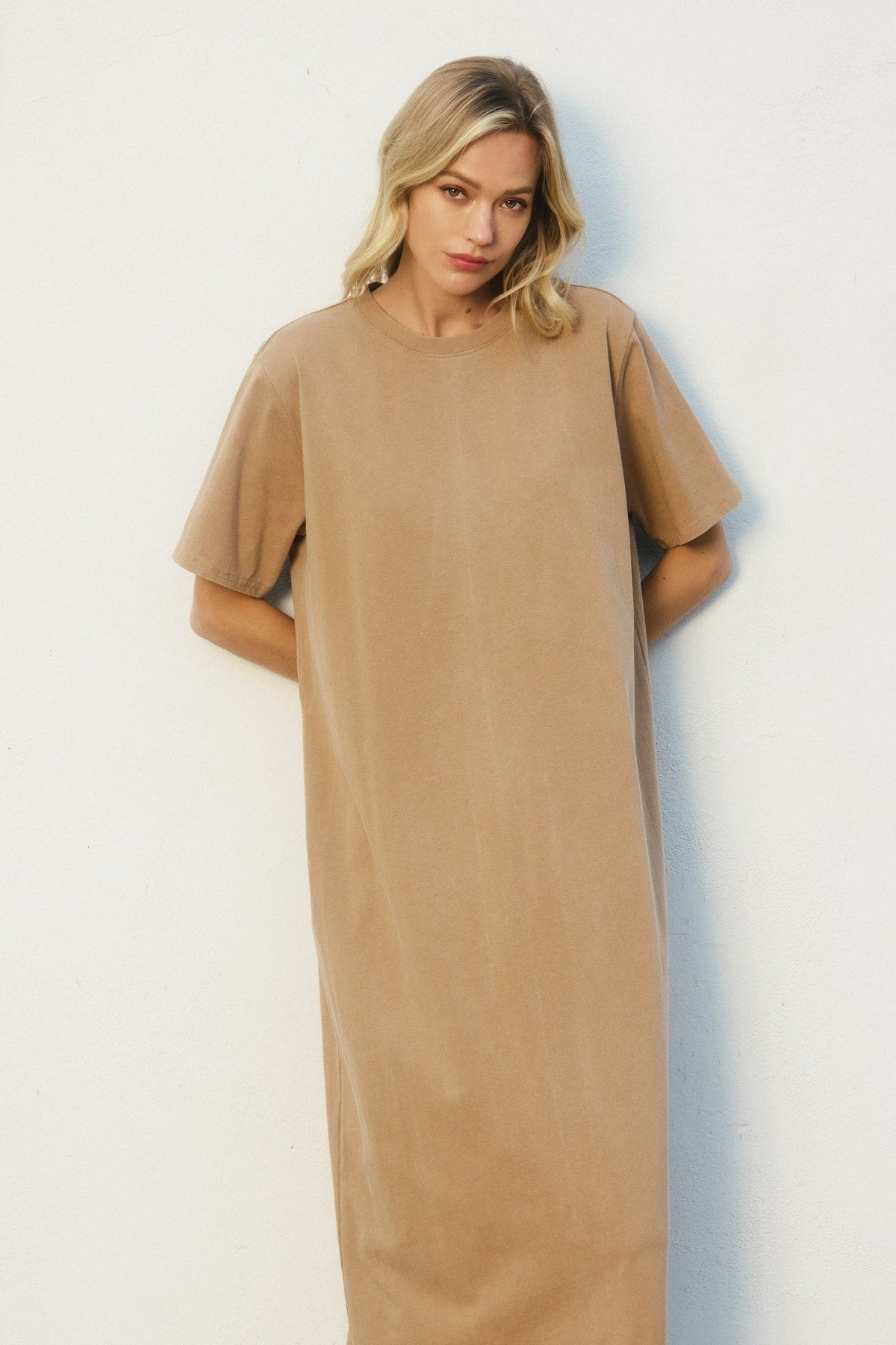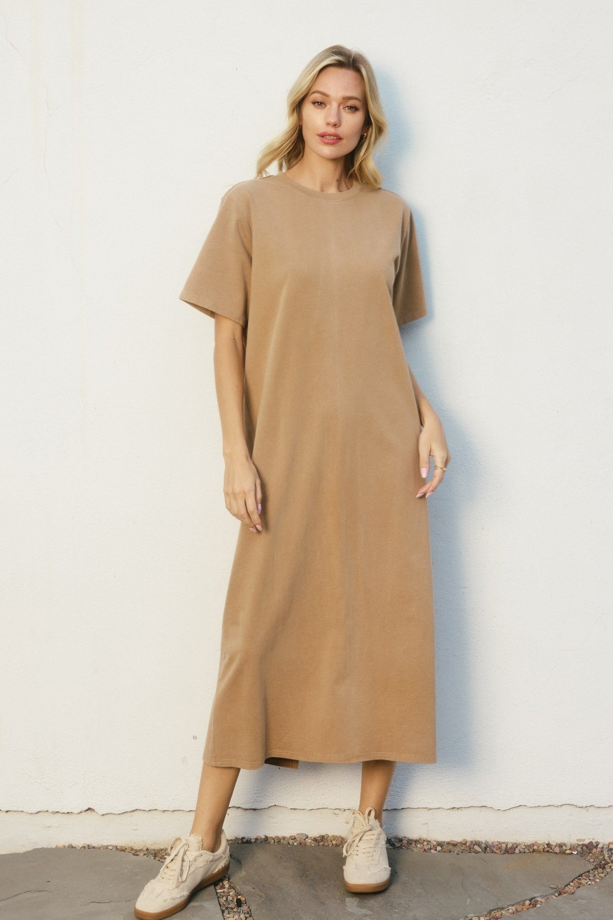 Meet Peyton, your new go-to for effortless style. This washed, basic t-shirt dress features a relaxed fit that feels like a cozy hug all day long. With short sleeves and a breezy back slit, it strikes the perfect balance between casual and cool. Whether you wear it as a midi or let it flow to maxi length, Peyton keeps things light and unlined—ideal for sunny days or layering with flair. Easy, comfy, and a little bit playful, it’s the dress that’s ready whenever you are.
