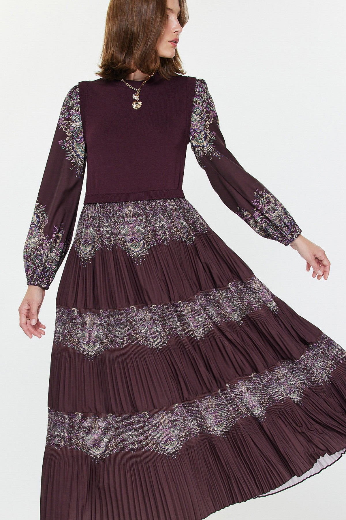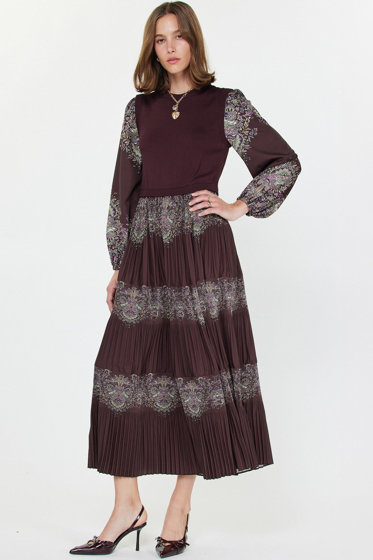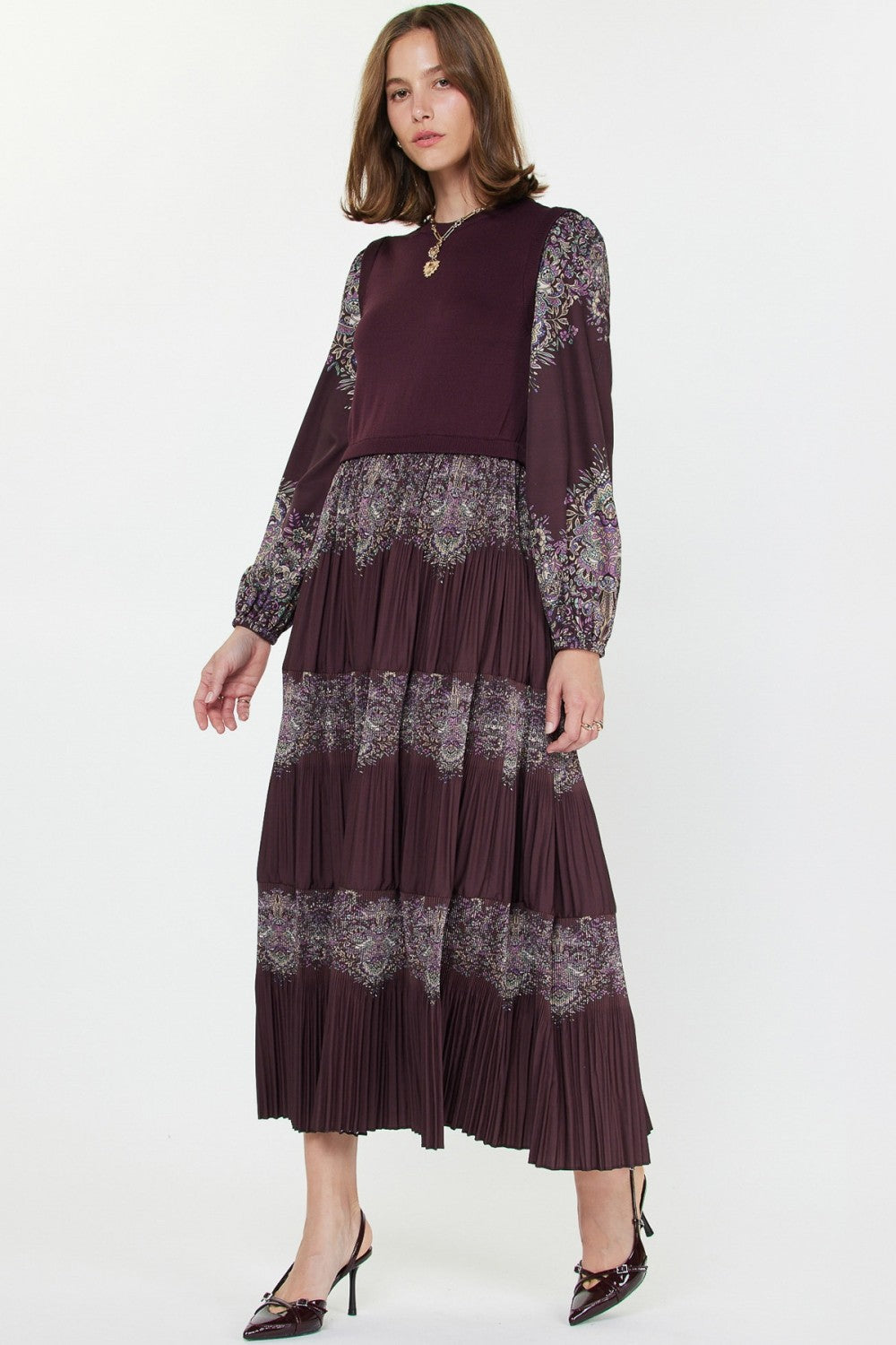 Embrace playful elegance with the Roosevelt midi dress. Featuring a cozy sweater bodice with a classic crew neckline, it seamlessly blends comfort and style. The long sleeves showcase a vibrant woven paisley print, adding a whimsical touch, while the micro-pleated tiered skirt brings movement and flair to every step. Perfect for those who love a mix of textures and patterns in one chic look.
