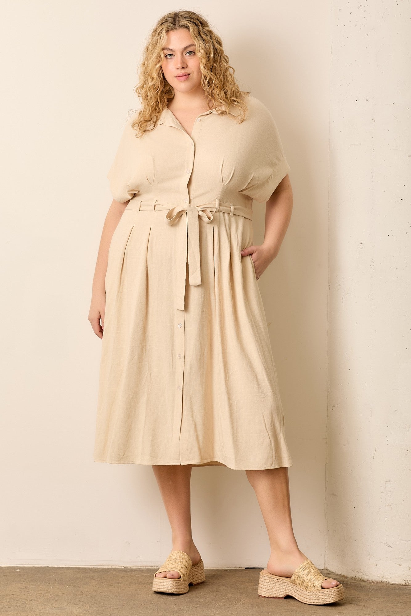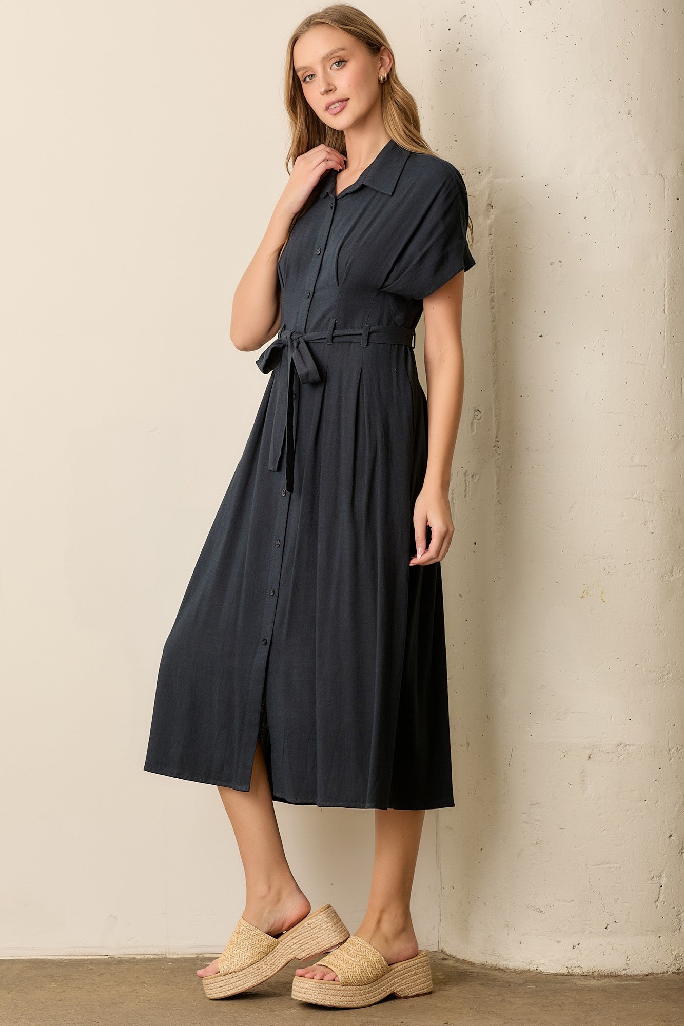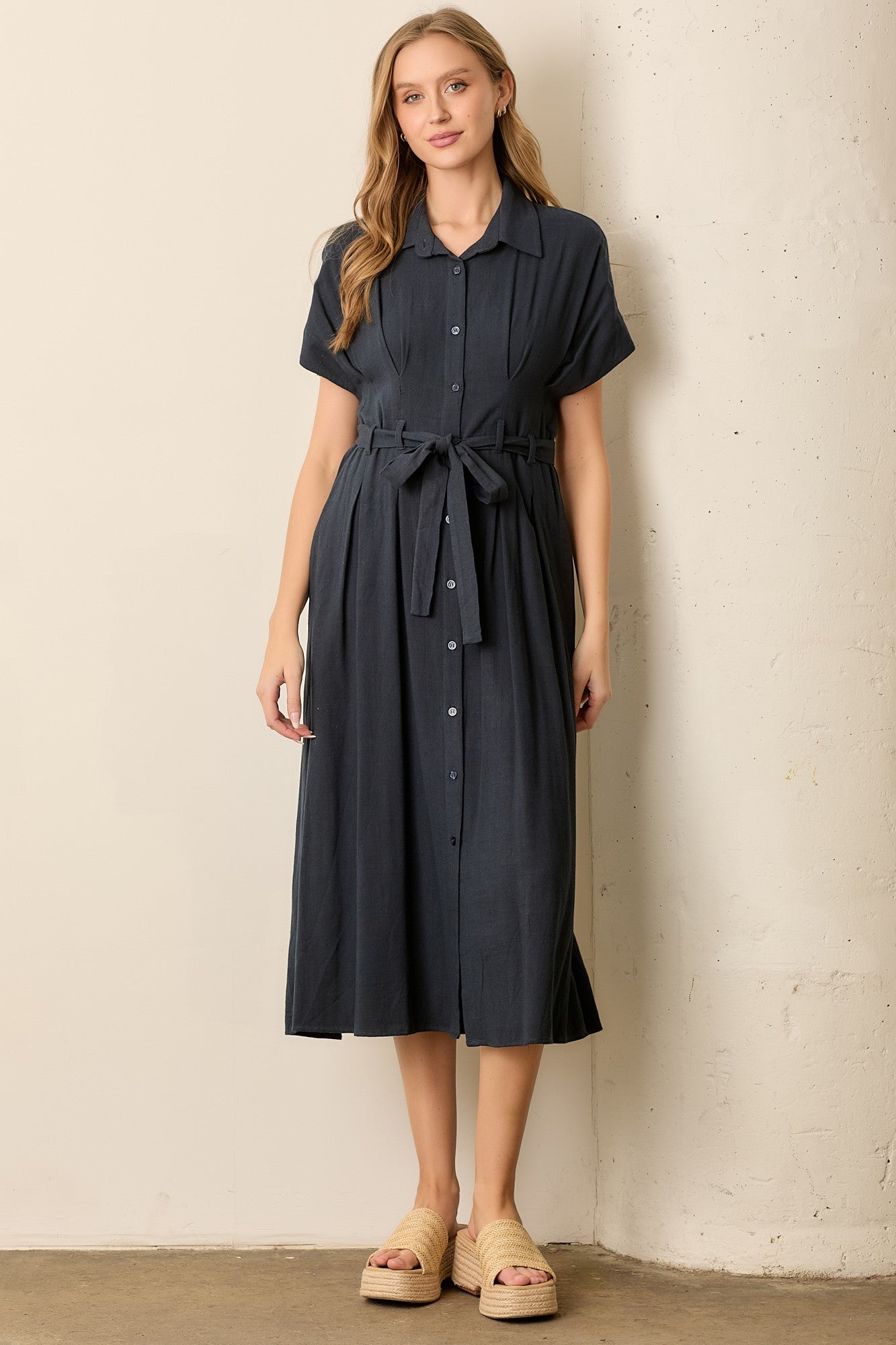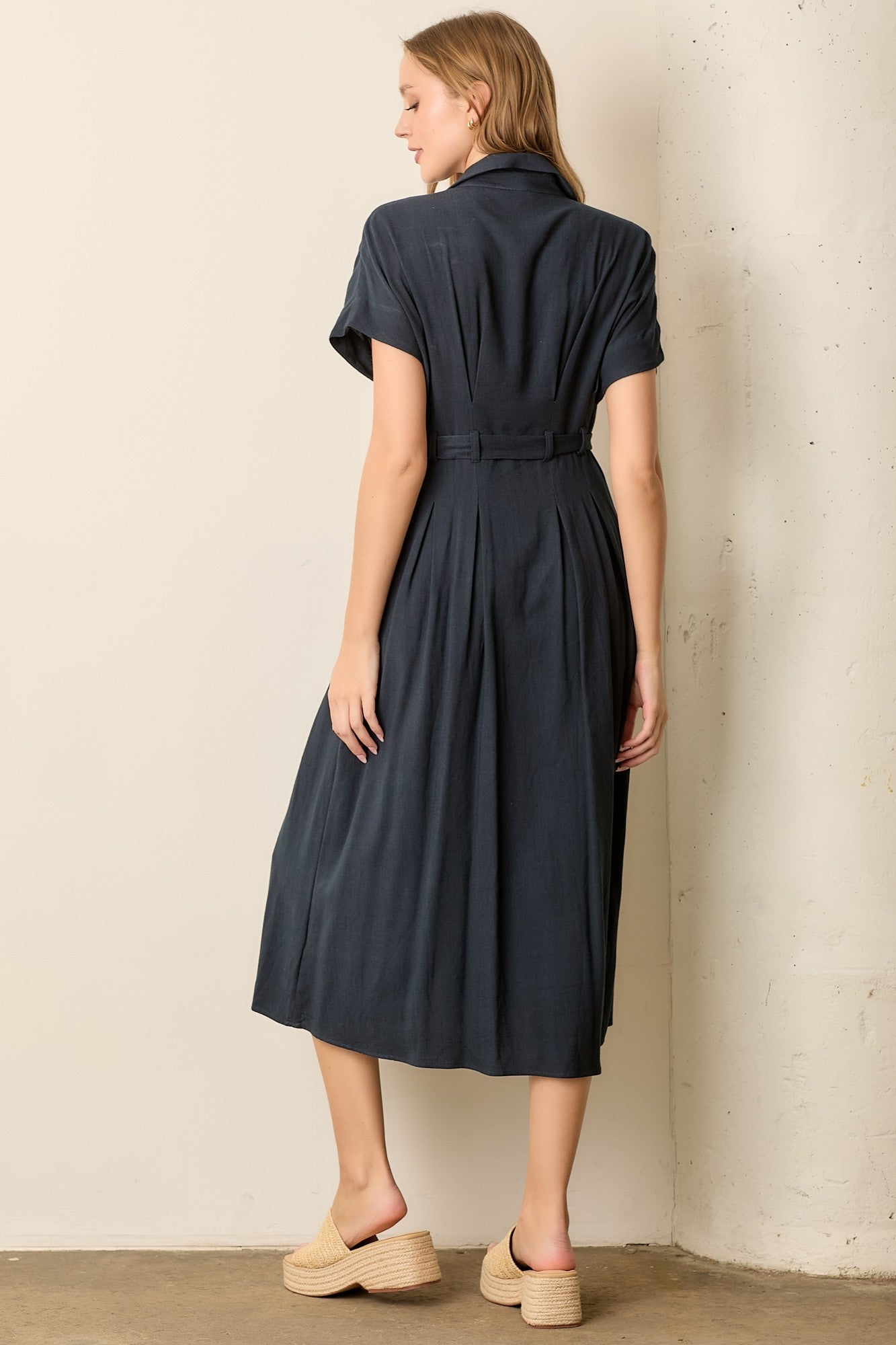 The Stacey dress in navy brings playful charm with its collared neckline and button-front design. Short sleeves keep it breezy, while the self-tie waist belt adds a flirty touch and perfect definition. Pleated details add movement and a touch of fun sophistication to this midi silhouette, making it a delightful choice for day or night.