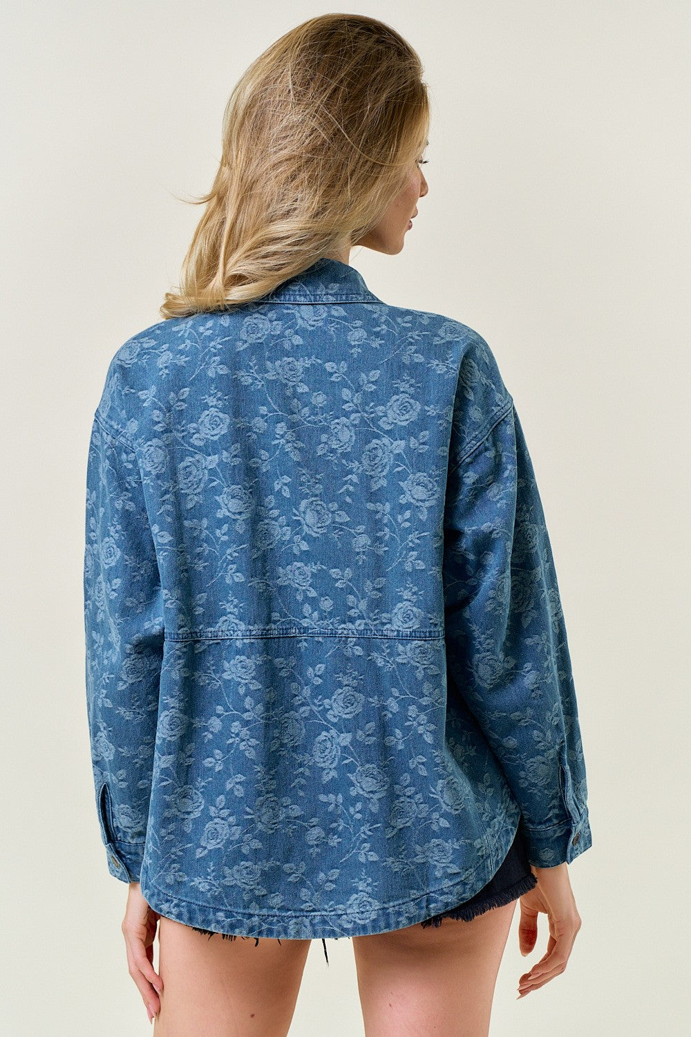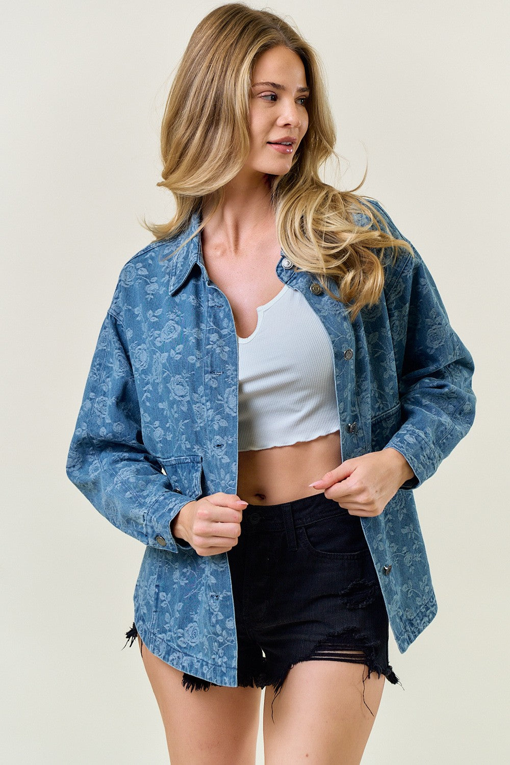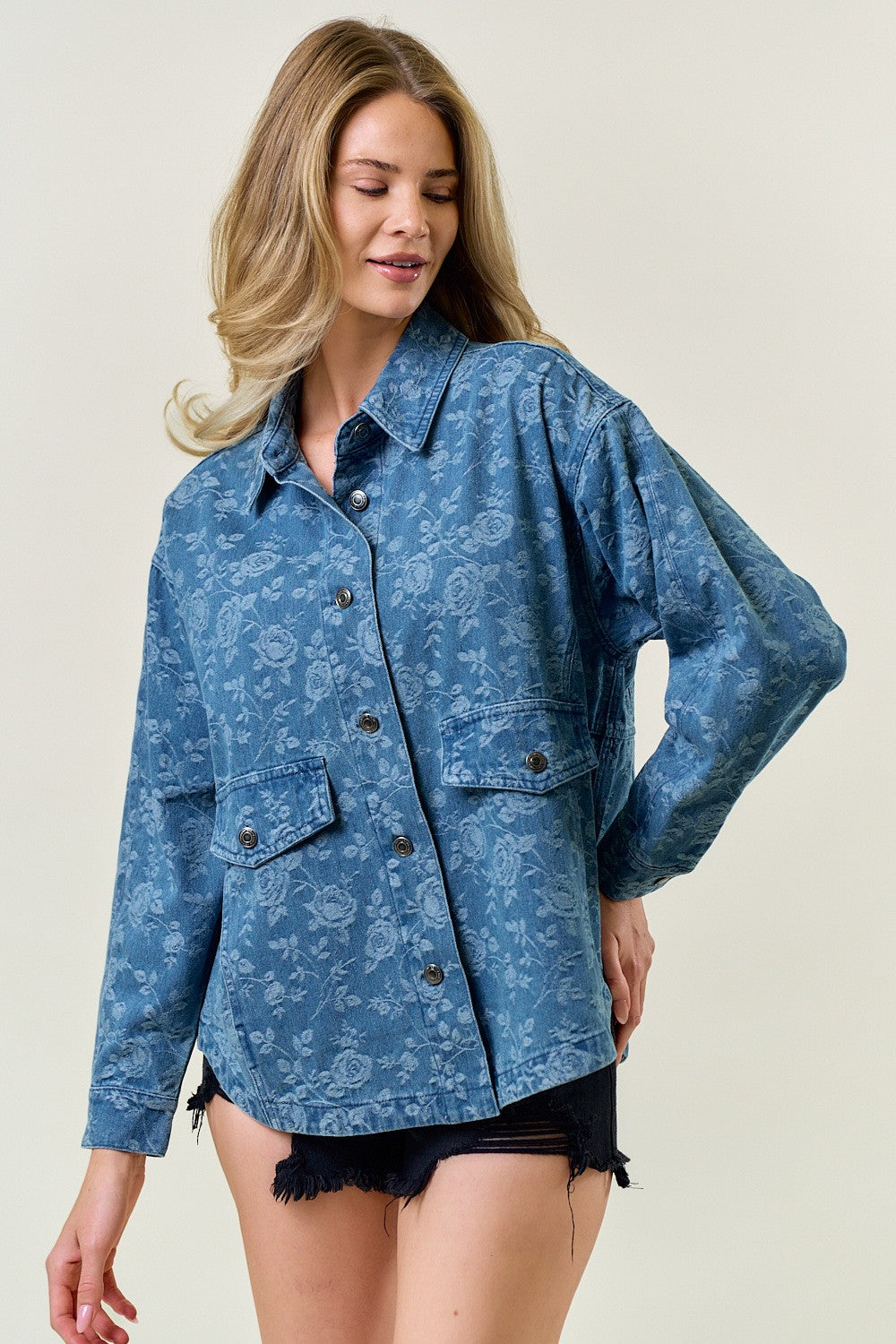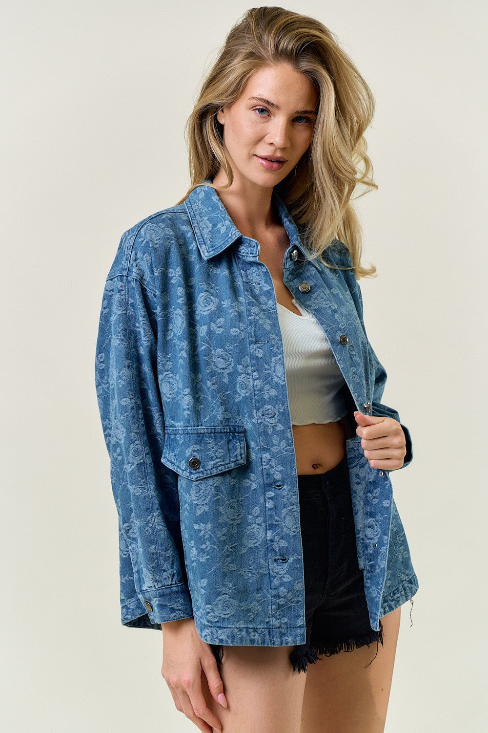 Meet Grady, the denim jacket that puts a fresh twist on classic cool. Featuring a relaxed, oversized fit and a shiny metallic chintz floral pattern, it’s your perfect mix of edgy and fun. With a classic shirt collar, button-down front, and a stylish front flap pocket with button detail, Grady offers comfort and charm in every wear. Perfect for layering or standing out solo, this jacket is ready to bring some playful flair to your wardrobe.