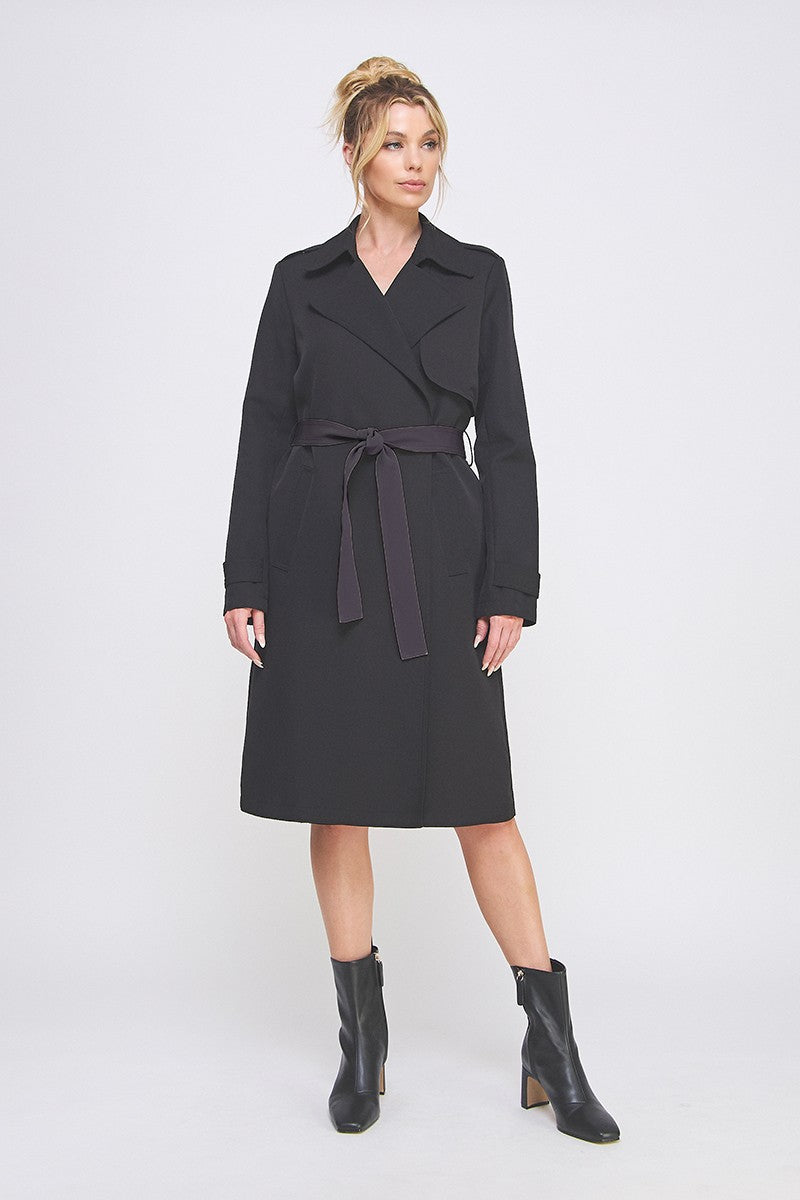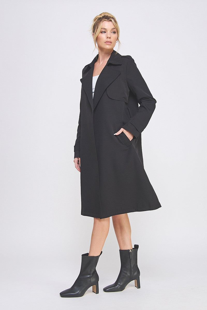 Step out in style with the Keaton trench coat—a sleek, long black beauty designed to turn heads. Its open front flows effortlessly, while side pockets offer functional charm for your essentials. Cinch the self-tie waist to show off your silhouette or let it hang loose for a relaxed vibe. Perfect for playfully layering over any outfit, Keaton blends classic cool with modern ease, making every day a little more fabulous.
