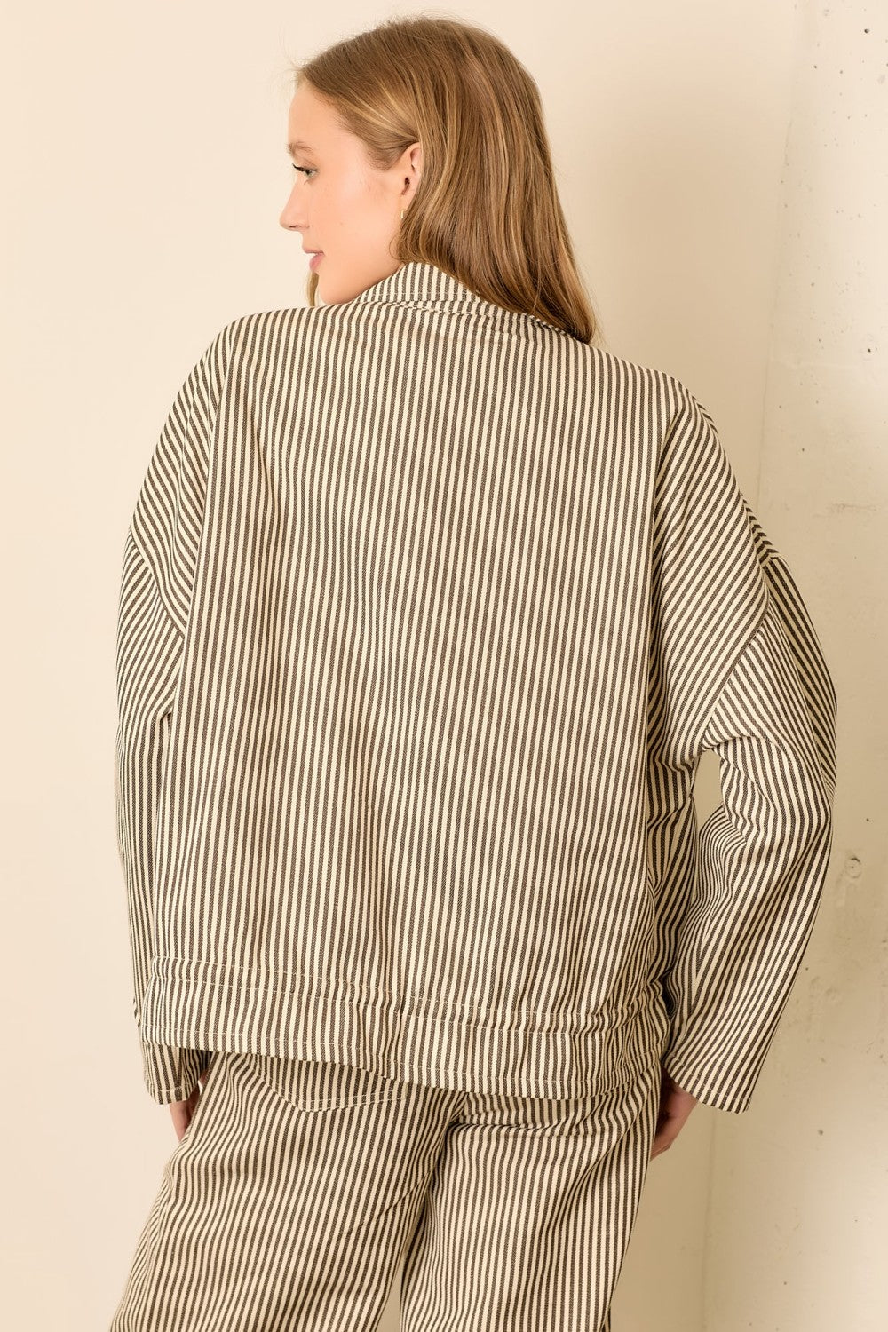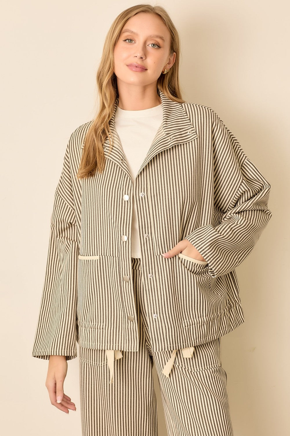 Get cozy in the Yale jacket, featuring a playful pinstripe pattern in warm mocha and cream. Its collared, boxy fit is balanced with snap buttons down the front and handy patch pockets for your essentials. The drawstring at the hem lets you customize your look, making it the perfect mix of fun and function for cooler days.