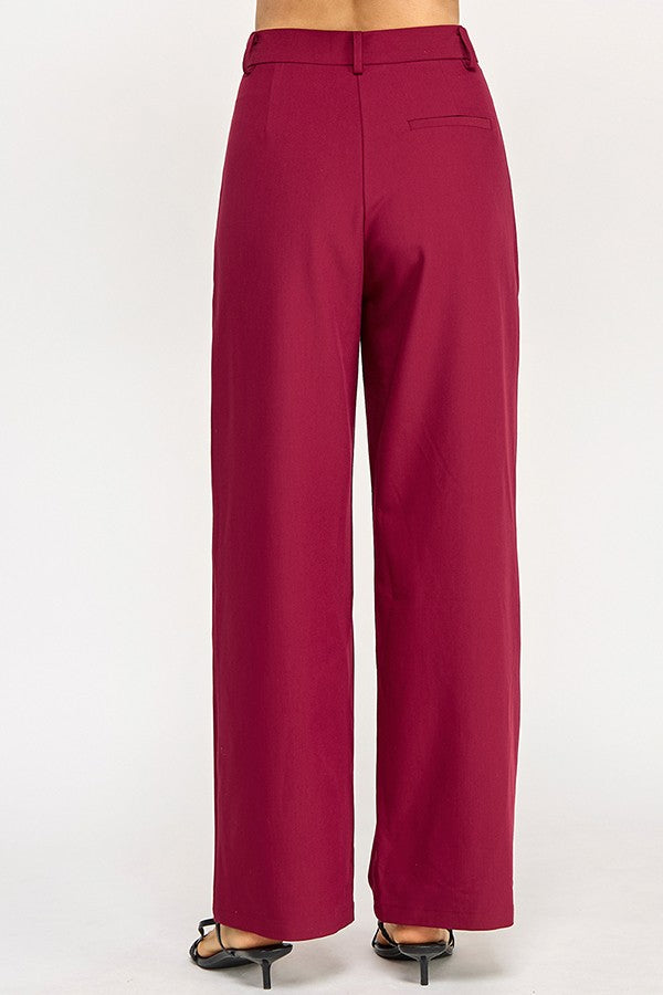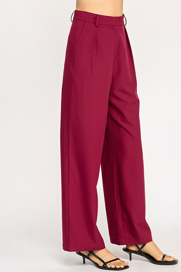 Step out in style with the Olympia tailored wide-leg pants. Featuring a chic front pleat and hidden side pockets, these pants perfectly blend classic elegance with a modern twist. The deep wine color adds a rich, playful flair to any outfit, making them as fun as they are sophisticated.