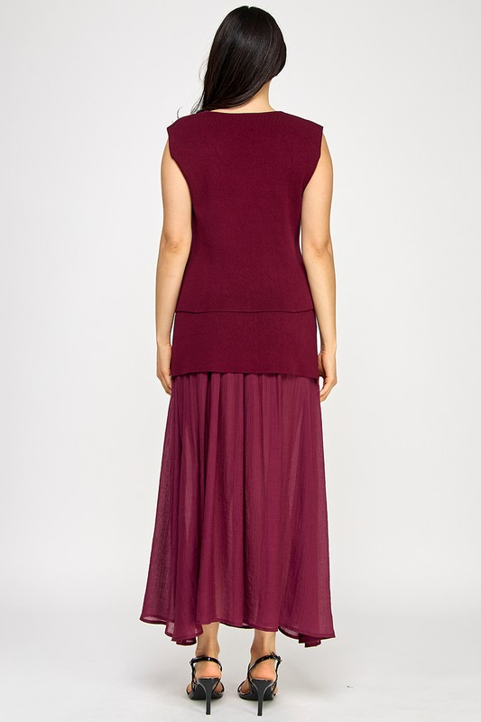 Elevate your style with the Merlot set, featuring a deep wine hue that captivates at every turn. The sleeveless vest top, with its playful button-front and flattering V-neckline, pairs perfectly with the maxi-length skirt. Designed with mixed media, the skirt’s knit top layers into a light and flowy bottom that moves with you, blending comfort and elegance effortlessly. Perfect for days when you want to feel effortlessly chic and spirited.