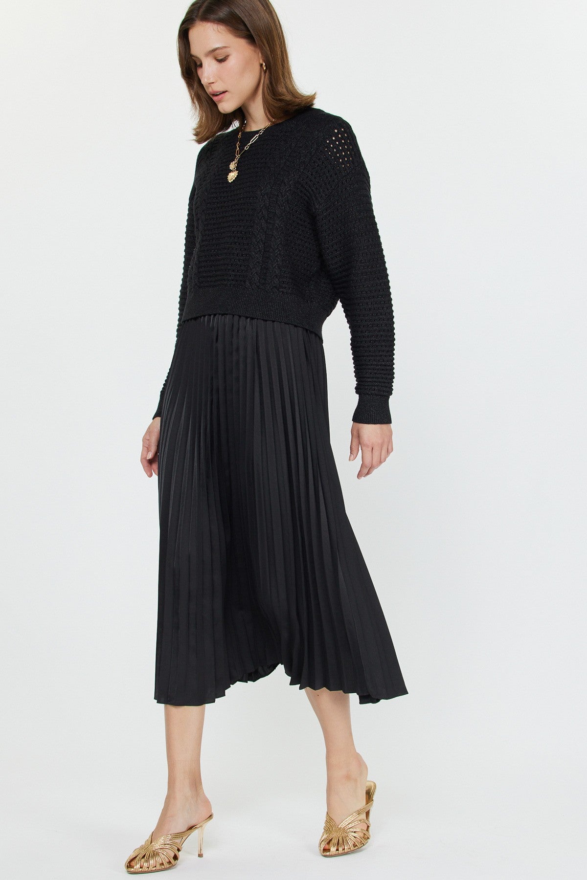 Elevate your style with the Night to Day set: a cozy cable knit pullover sweater and a sleek sleeveless satin midi dress with a pleated skirt. Wear them together for a chic layered look that’s perfect from dusk till dawn, or mix and match separately to keep your wardrobe fun and versatile all day long. Play with textures and let your outfit shine whenever inspiration strikes!