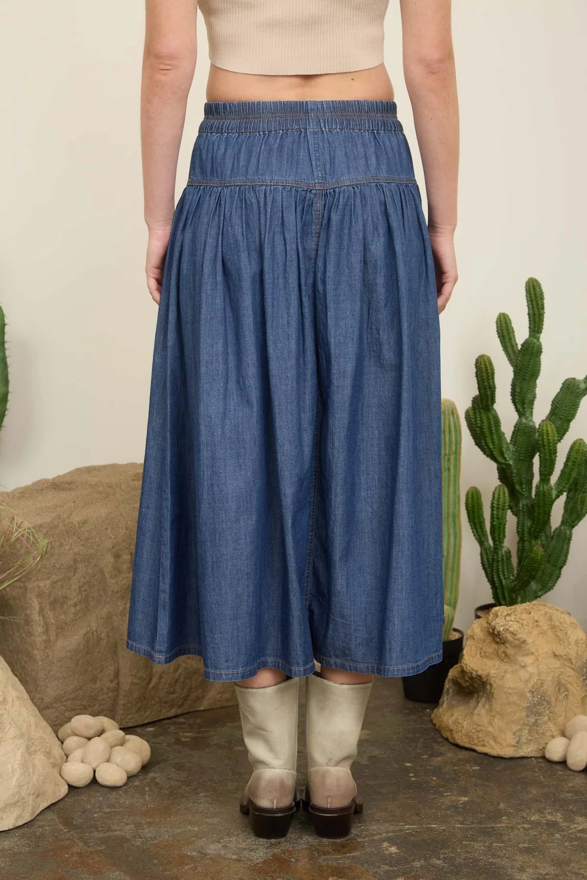 The Dorothy is your new go-to denim maxi with serious style credentials. A charming pintuck yoke adds texture and dimension up top, while a front tie detail brings an effortless, flirty vibe. Pearl-like buttons down the front catch the light beautifully, and the elastic waist keeps things comfy all day long. Timeless denim construction meets modern details in this playful skirt that transitions seamlessly from casual weekends to dressed-up evenings.
