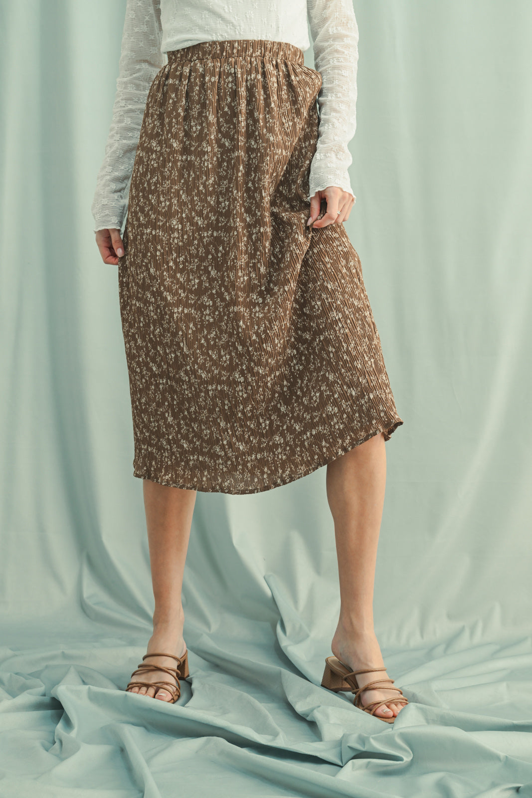 Embrace effortless charm with the Finley midi skirt, featuring a playful floral print on soft crinkle fabric. Its elastic waistband offers all-day comfort, while the espresso and cream hues create a warm, inviting palette. Fully lined for a smooth fit, this skirt twirls beautifully, perfect for sunny days and spontaneous adventures.