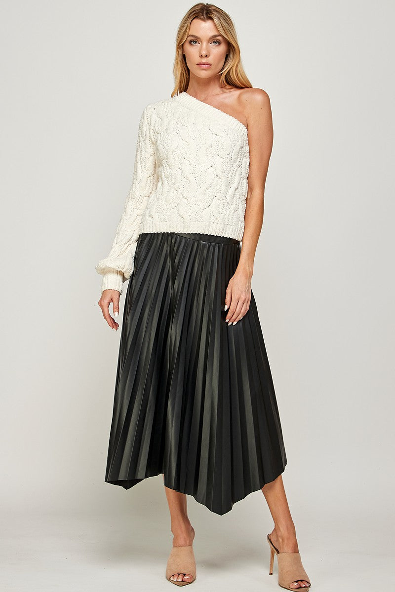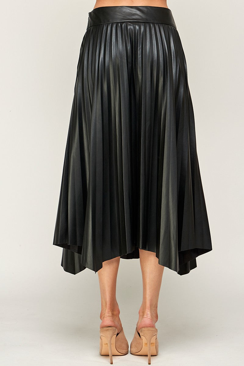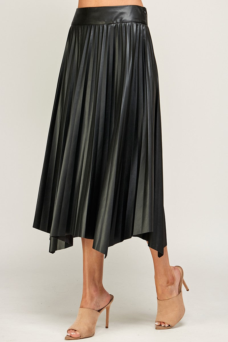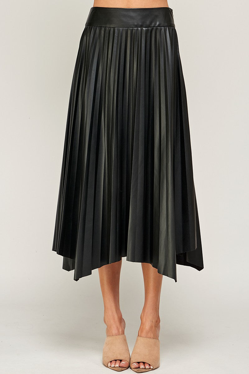 Elevate your style with the Joan midi skirt, featuring playful pleats and a chic faux leather finish. Its high-waisted, banded fit flatters your waist while the A-line silhouette offers effortless movement. Finished with an uneven hemline, this skirt brings a fun twist to your wardrobe essentials. Perfect for making a statement wherever you go!