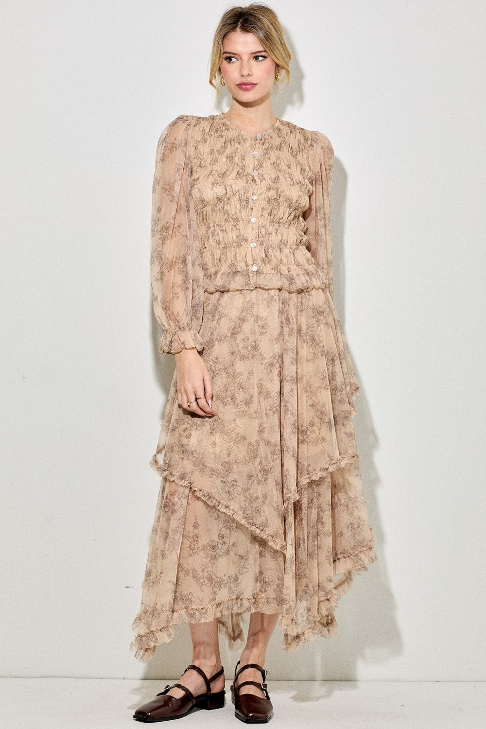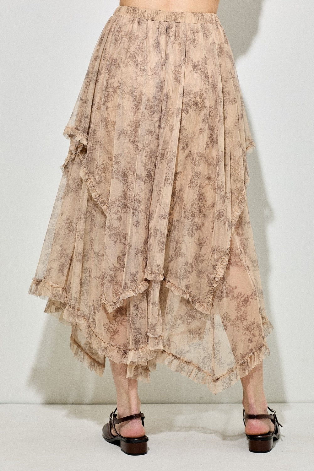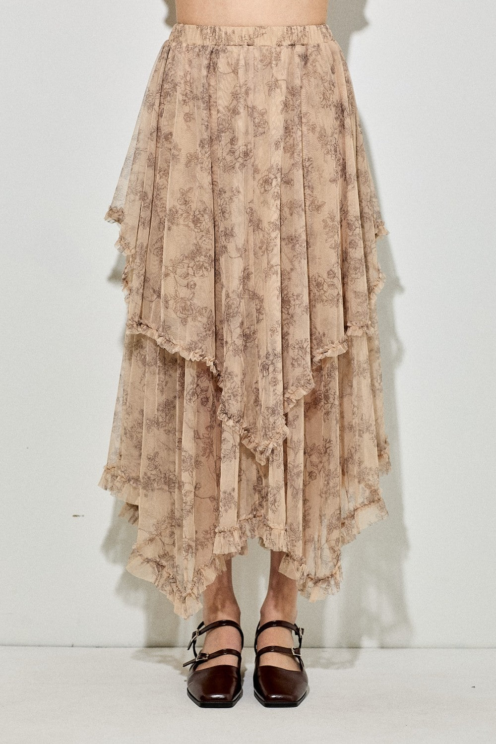 Step into sunshine with the Purdie floral print midi skirt. Featuring a playful asymmetrical cut and a flirty ruffle hem, it adds fun movement to every step. The elastic waist ensures a comfy fit while flattering your silhouette. Perfect for twirling through warm days or dressing up your casual look with a touch of charm.