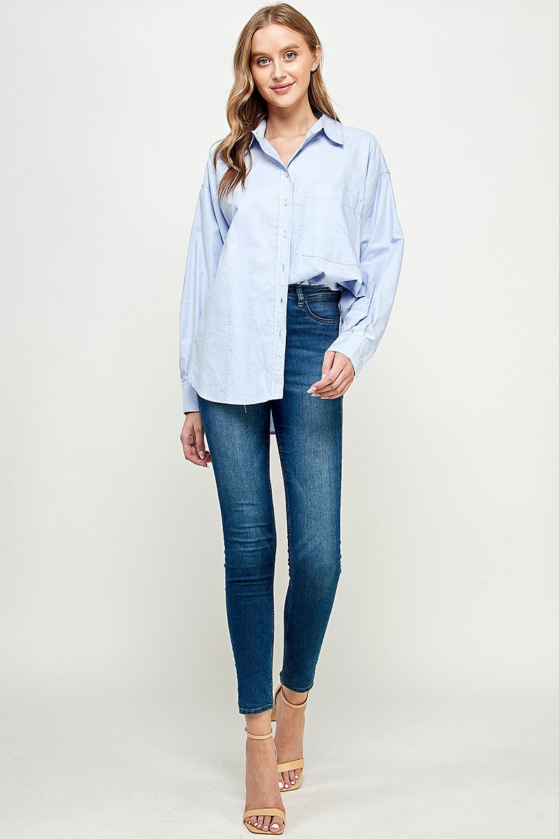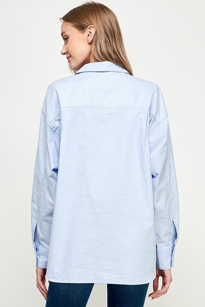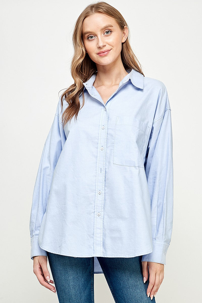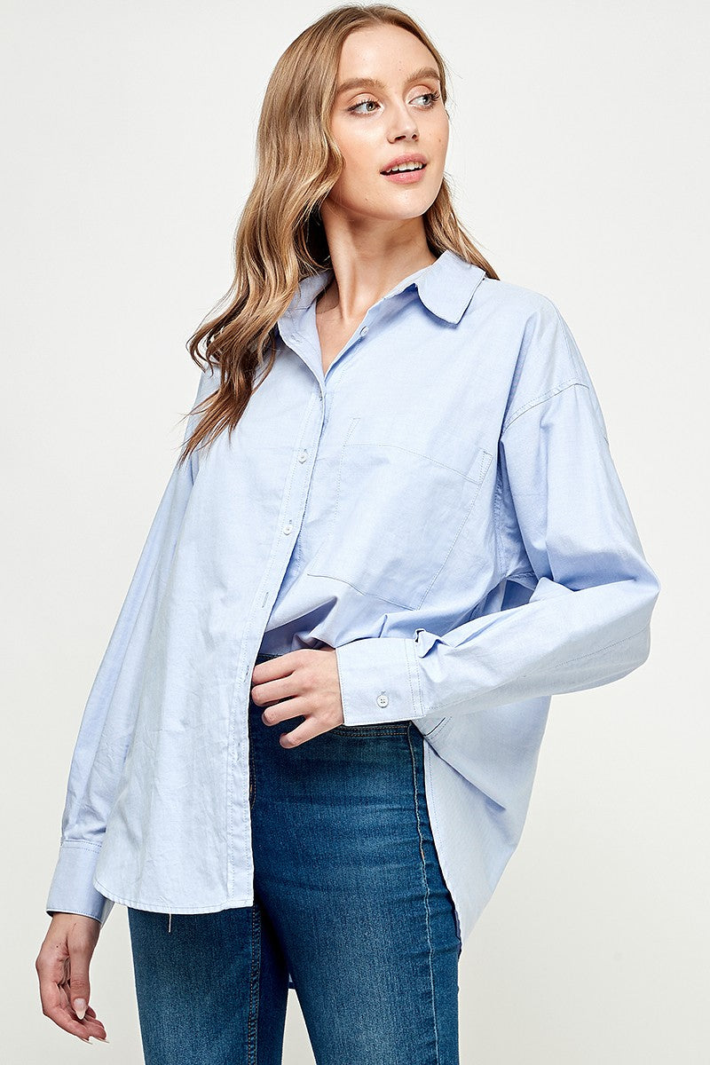 Meet your new favorite: the All Business shirt. This oversized, collared button-down brings effortless cool with a classic boyfriend fit and a front patch pocket for a touch of laid-back charm. Long cuffed sleeves and a high-low hem add playful details that move with you—whether you’re headed to work or out for fun.