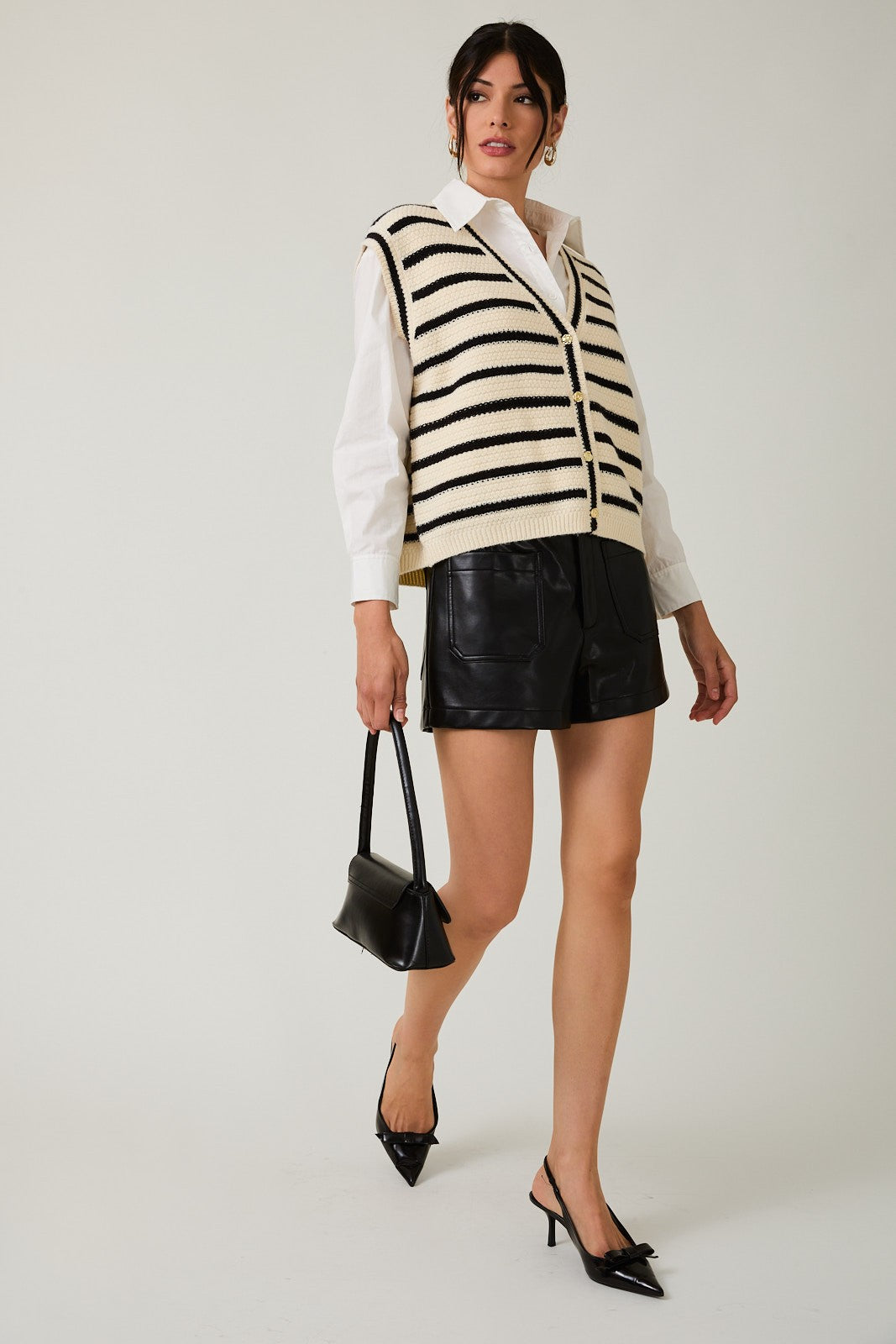 Elevate your style with Drew, a playful sweater vest featuring a chic black and white stripe design. This sleeveless piece boasts a flattering v-neck and a button-front adorned with eye-catching gold buttons, perfect for adding a touch of fun to any outfit. Whether layered over a blouse or worn solo, Drew brings a spirited twist to your wardrobe essentials.