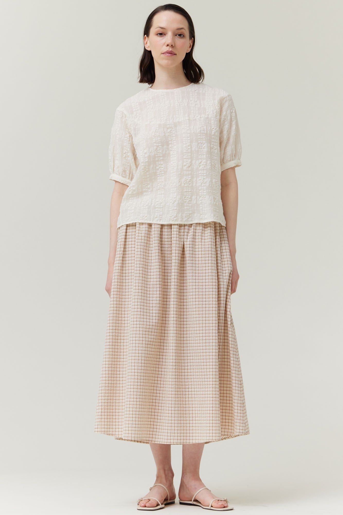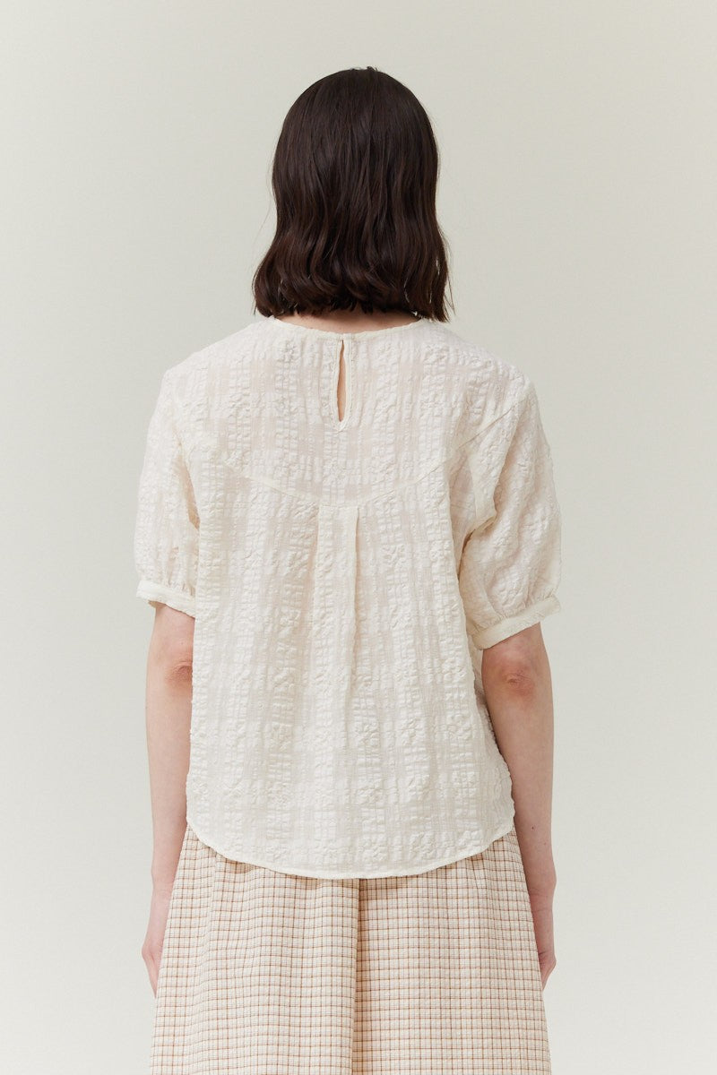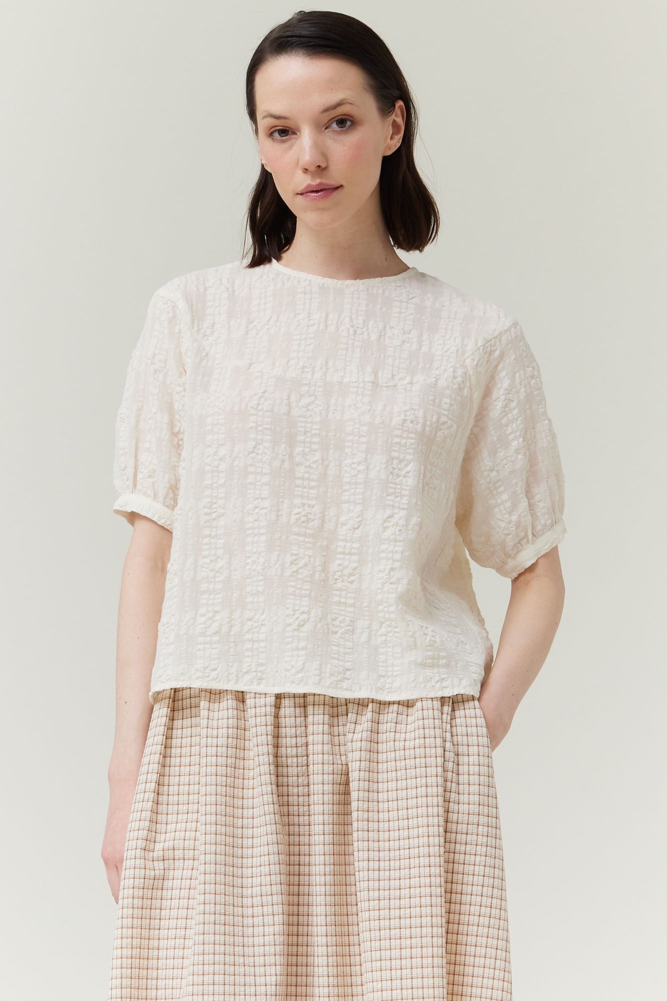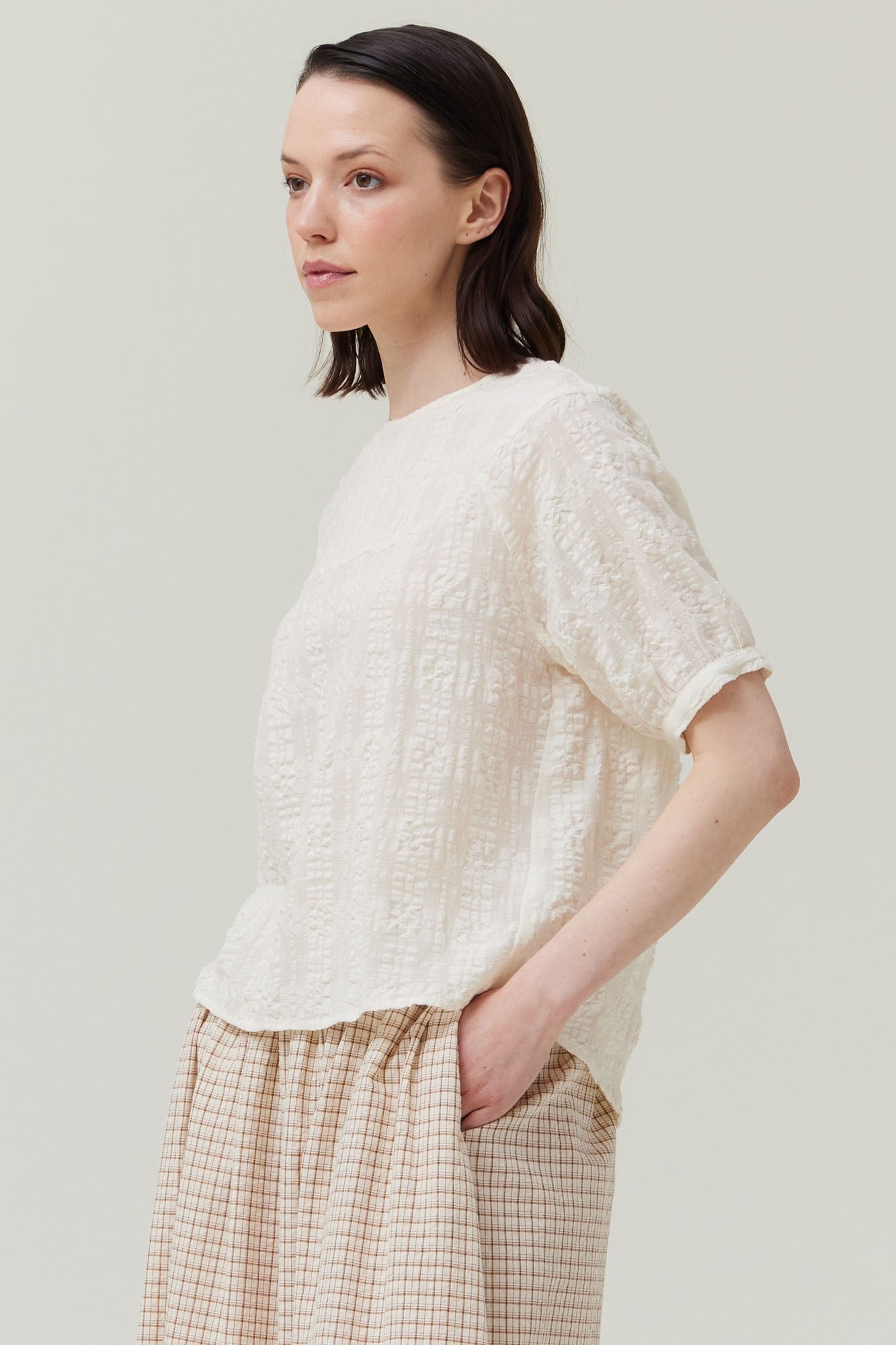 The Fanny top features a loose fit and textured fabric in a soft ecru shade, perfect for effortless style. Its short, slightly bubble sleeves end in fitted cuffs, adding a fun twist to the classic round neck design. Comfortable and charming, it’s a playful addition to your wardrobe.