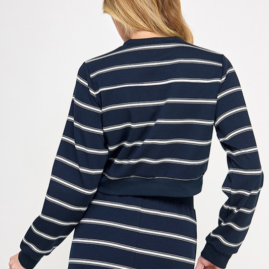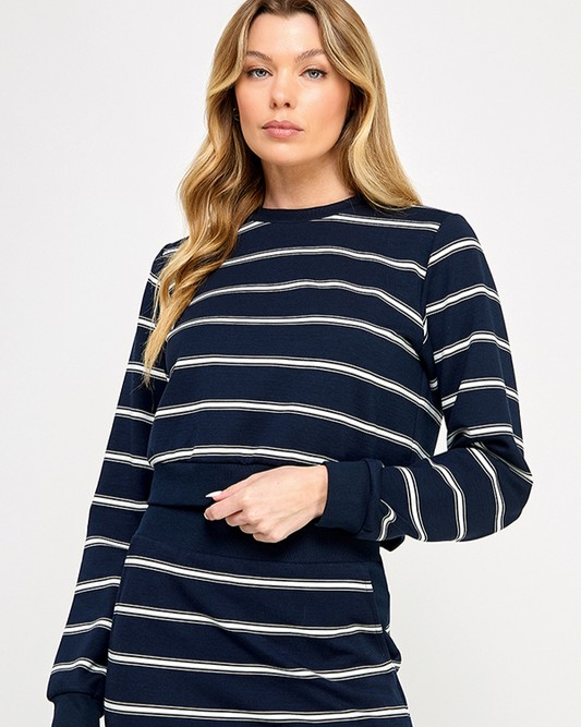 Add a splash of fun to your wardrobe with the Isolde Top. This long-sleeve sweatshirt features classic navy and white stripes, perfect for playful layering or cozy days. Its soft fabric keeps you comfy while the timeless pattern adds a cheerful twist to any outfit.