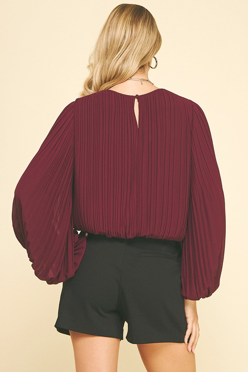 Add a touch of whimsy to your wardrobe with the Maryann blouse. Featuring playful bishop sleeves and a charming bubble silhouette, this deep wine-colored top is finished with delicate pleated fabric and a round neckline. A subtle back button closure adds a sweet detail, making Maryann perfect for days when you want to feel effortlessly stylish and fun.