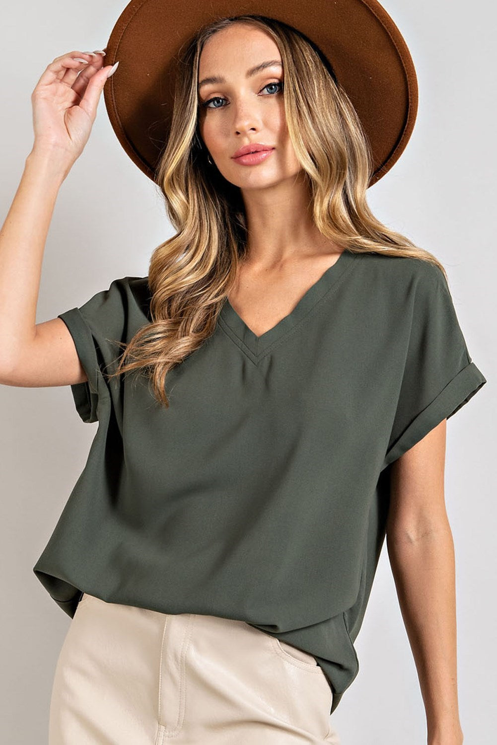 Stay effortlessly cool in the Uma top, featuring a relaxed fit that drapes comfortably. Its playful olive hue pairs perfectly with casual looks, while the v-neck adds a touch of flair. Short sleeves with rolled cuffs give this top a laid-back vibe, making it your new go-to for easy, everyday style.
