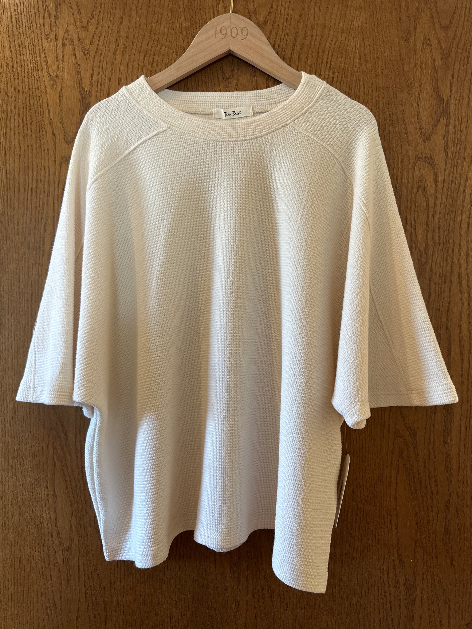 Float through your day in the Wylla top, where soft, cloudy knit meets a relaxed, cozy fit. The cream fabric wraps you gently, while the drop shoulder and 3/4 sleeves add a carefree vibe. With a simple round neck and effortless style, this playful essential feels as light as a cloud.