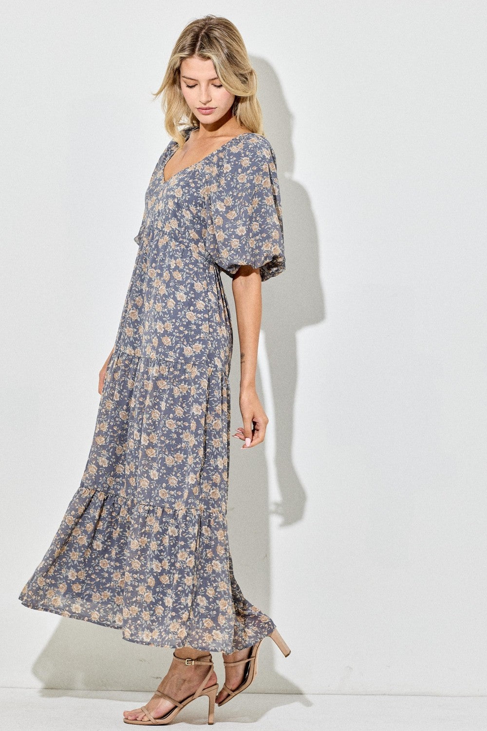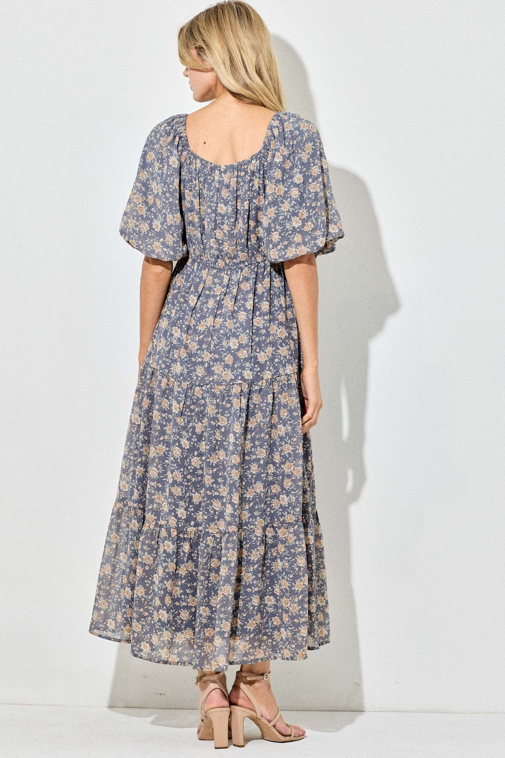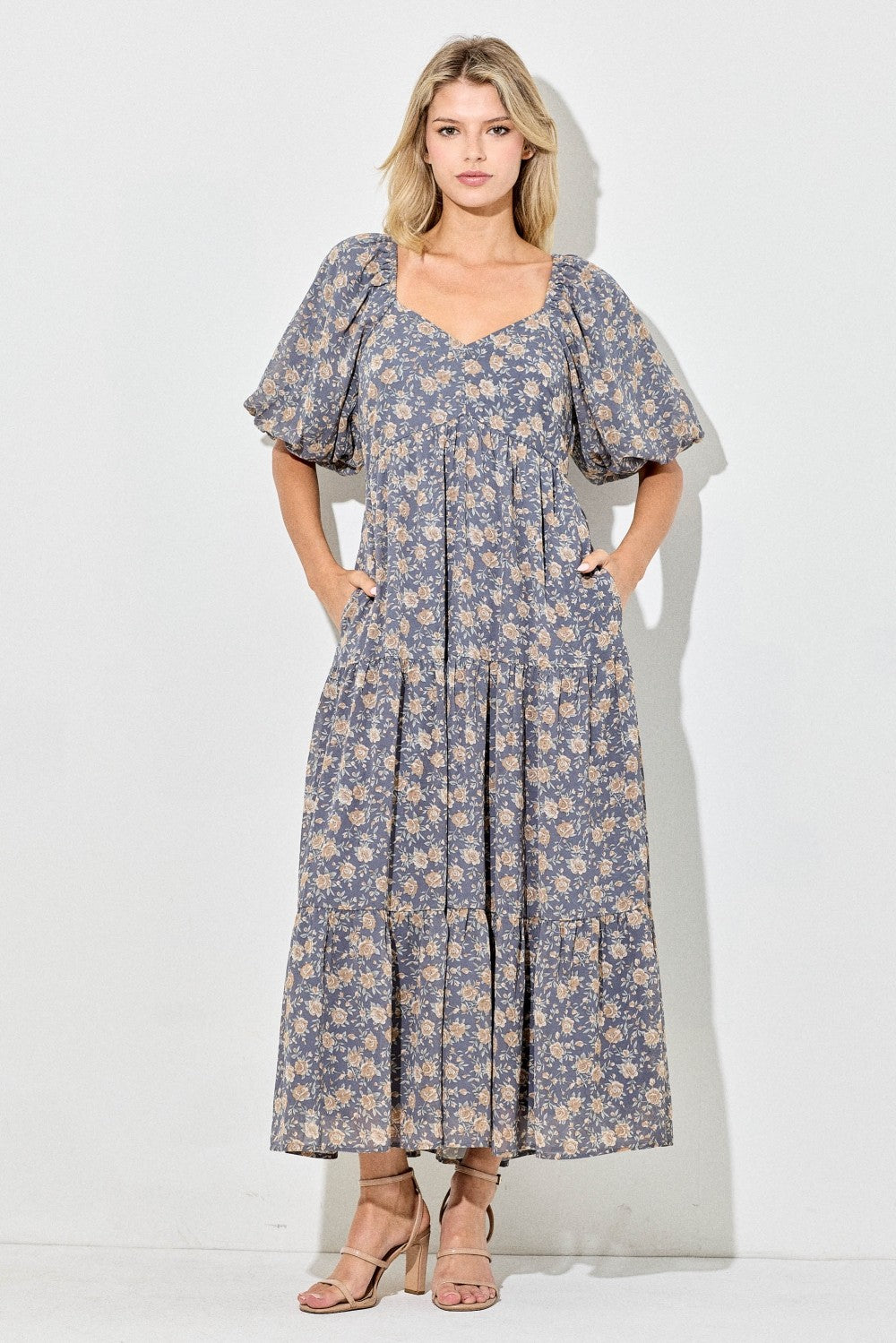 The Perla dress blends playful charm with practical style. Featuring a vibrant floral print in soothing blue and slate grey tones, this midi-length dress delights with its short bubble sleeves and tiered skirt that add flirty volume. Its flattering v-neckline enhances your silhouette, while handy side pockets bring everyday ease. Perfect for brightening any occasion with a fun, feminine touch.